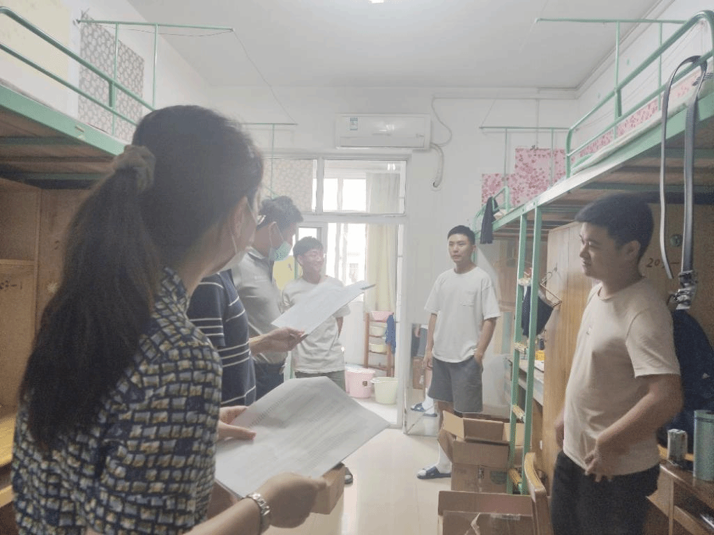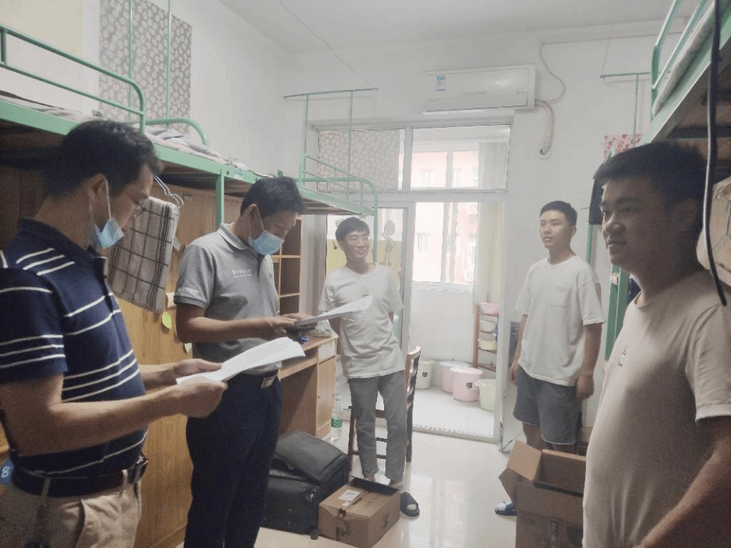 在南湖6栋男生宿舍,李玉海院长首先代表学院对新同学的到来表示欢迎,随后详细的询问了新生的户籍来源、所学专业、住校情况以及遇到了哪些实际困难等,并提醒各位同学要注意温度变化及信息安全,防止上当受骗等行为的发生。卢新元副院长热情地询问同学们的专业与导师,并与同学们就学习问题开展进一步交流,耐心的教导同学们应强化专业学习,提高专业素养。王涛副书记嘱咐新生今后在学习或者生活中遇到困难可及时联系辅导员帮助解决,提醒同学们注意秋季寒热交替。