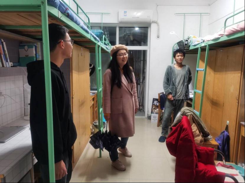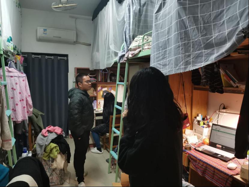 安全教育活动结束后,辅导员们在各年级学生会社区生活部的带领下,到达各自年级学生公寓进行抽查。查寝过程中,关于寝室用电安全问题、防火问题及宿舍通道摆放问题,各年级辅导员向同学们强调有关安全知识,并检查学生寝室是否存在安全隐患。与此同时,借本次查寝机会,辅导员也通过交谈了解同学们的生活,增进与学生间的联系。