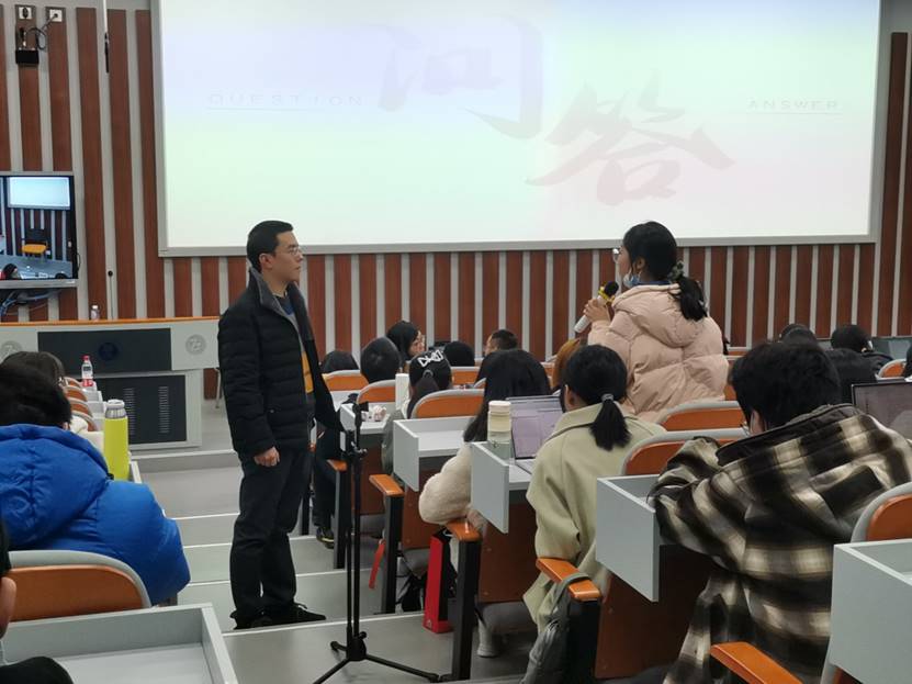在分享结束后,彭珵与现场同学进一步进行交流,解答同学们的问题。18级本科生刘奥就如何看待实习岗位与最终就业岗位不一致的问题向嘉宾提问彭珵表示实习过程是一个不断尝试的过程,在这个过程当中同学们可以寻找自己适合的、感兴趣的职业,企业选择人才是主要是从所应聘岗位的专业能力进行判断,而非只看所学的专业,并鼓励大家在本科学习阶段积极寻找合适的实习岗位,不断积累专业能力。蒋可鸣老师还请彭珵为大家介绍秋招与春招的不同之处,彭珵为同学们做出了详细的解答。