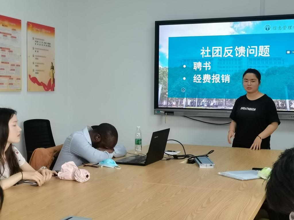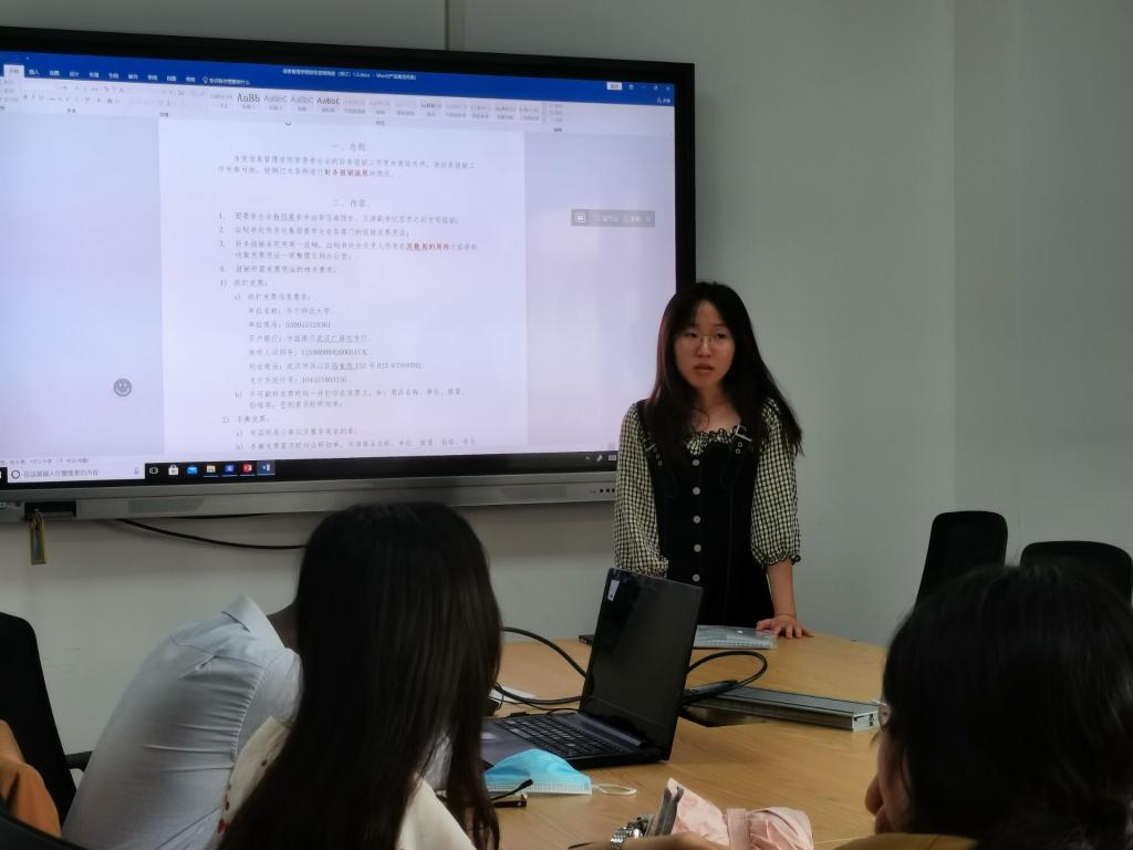会议最后,由廖瑜璐讲解有关于社团财务的相关问题。她对社团每年的可申报的经费做出说明,并对报销制度进行具体讲解。她特别强调,无论是哪种发票均需要交代好交易情况,电子发票需在打印后在发票的右下角写清事由和活动名称。信息管理学院不支持收据报销,需自行购买手撕发票,誊写上相关信息。最终社团财务部需把财务资料上交至学院秘书处和社团联合部各一份。