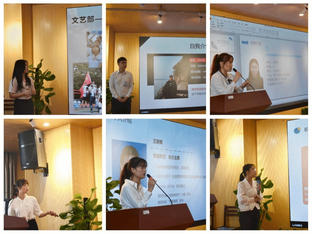 根据大会安排,须选举产生华中师范大学信息管理学院第十八届研究生会团总支主席团。按照会前抽签顺序,第十八届主席团候选人张宁、朱永迪、金梦蕊、吴瑾、王丽娜、程泽依次上台进行竞选陈述。六名候选人陈述完毕后,就主席团、学院老师以及研究生代表提出的问题进行回答,提出了对于竞选职位的看法以及未来工作展望。依据各候选人竞选演讲,与会研究生代表进行投票,大会总监票人进行现场唱票并宣布选举结果。最后依据投票结果选举出第十八届研究生会团总支主席团成员为:程泽、王丽娜、吴瑾、朱永迪。