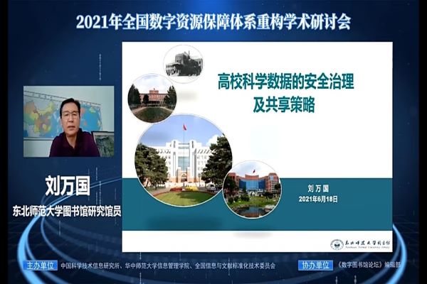 之后,刘万国研究馆员作了《高校科学数据的安全治理及共享策略》主题报告,介绍了科学数据的来源、种类及价值进行了分析,指出了科学数据需要开展安全治理的主要原因,并从教育部公共服务、高校和图书馆三个方面提出了科学数据安全治理和共享的策略。