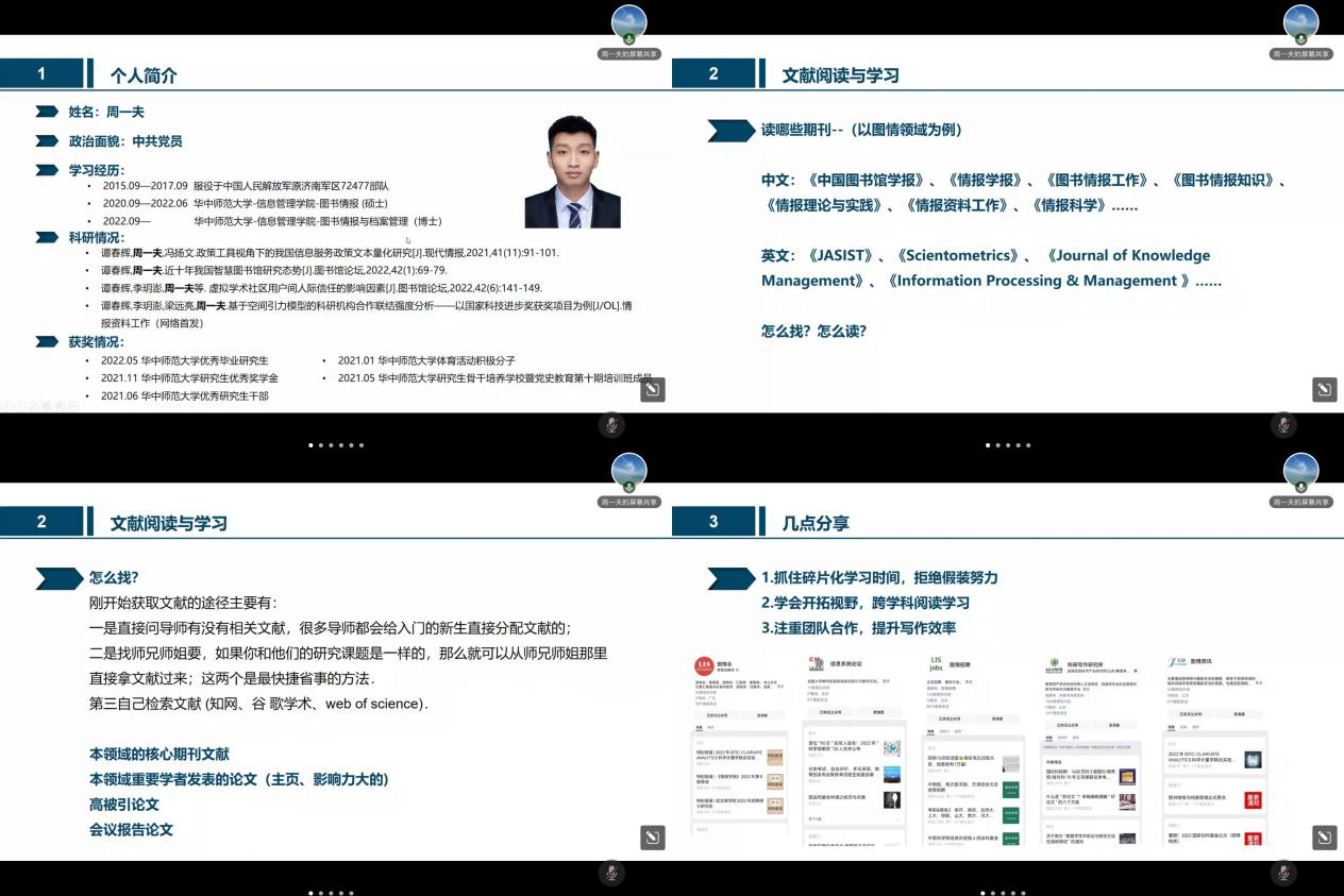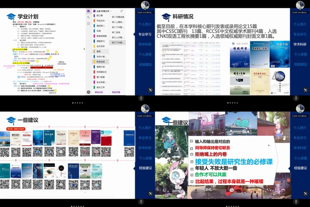 第一位分享的同学为来自2019级情报学专业的代沁泉。首先,代沁泉提出要有明确具体的学业计划,保证课业学习成绩的情况下积极参加学术活动听讲座。其次,代沁泉为同学们推荐了一些微信公众号,提醒同学们要积极利用好这些资源。最后,代沁泉还为同学们分享了选择研究方向的方法以及一些学习、生活中的建议。