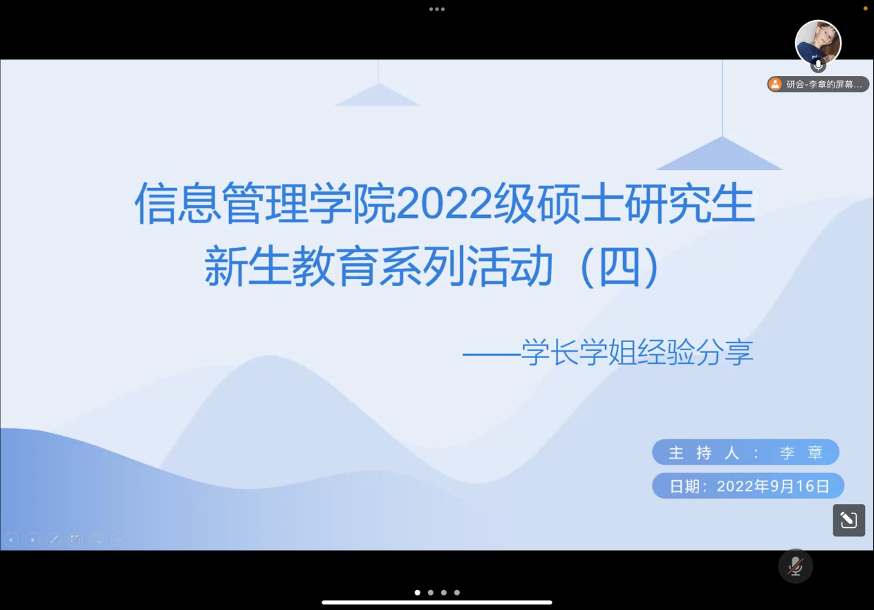 本次的优秀学长学姐经验分享会向2022级新生们传授了宝贵的学习经验和就业方向指导,期待2022级同学们能在此次分享会中能够有所收获,明确研究生阶段学习的目标,并照着目标坚定不移地走下去。至此,2022级信息管理学院硕士研究生第四次新生教育系列活动圆满结束。