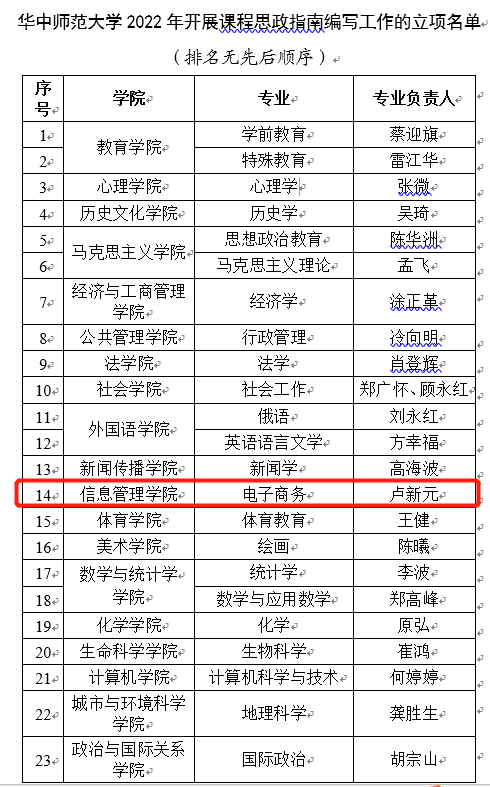 (通讯员 张梦雨)为全面深化推进学校课程思政建设,不断提高学校人才培养质量,学校开展了2022年按专业编制课程思政建设指南评审工作。经各本科教学单位申报、学校遴选,决定学前教育等23个专业开展按专业编制课程思政指南的建设工作。其中,我院电子商务专业获批学校第一批课程思政指南编写立项,项目由副院长卢新元教授负责。