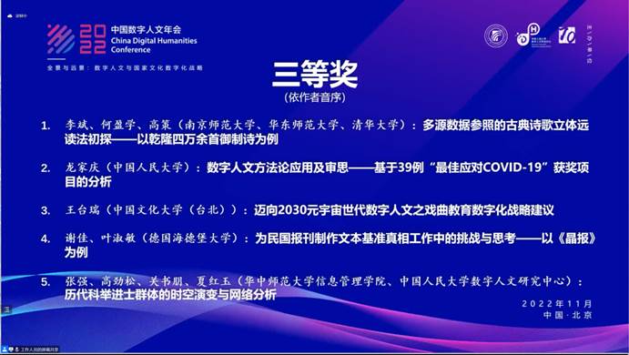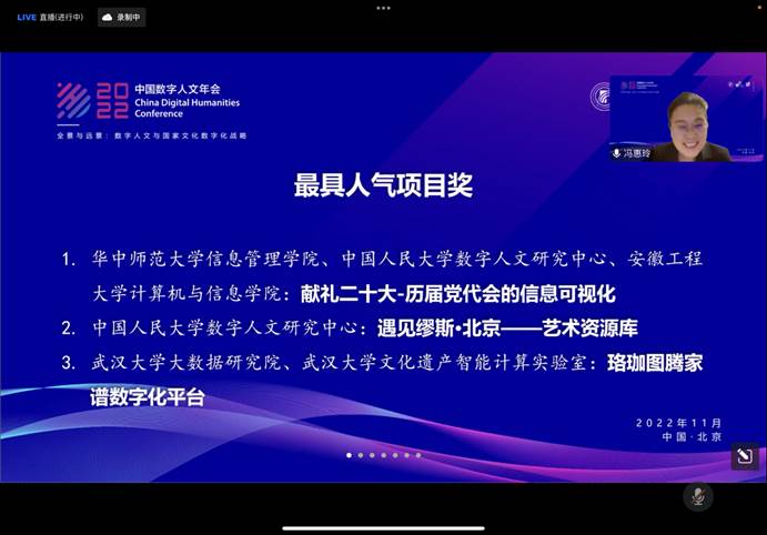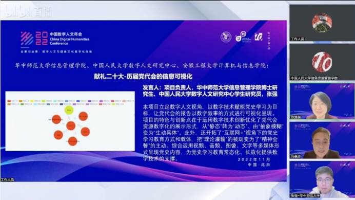 年会还面向全球征集评选出2022年中国数字人文年会优秀项目(以华语或中国研究为主题)共26项。由我院博士研究生张强主持开发的“献礼二十大-历届党代会的信息可视化”荣获“2022年中国数字人文年会优秀题材奖”。此外,本次大会还单独另设了最具人气项目奖,由中国人民大学信息资源管理学院一级教授冯惠玲颁奖,“献礼二十大-历届党代会的信息可视化”项目积极参与,在学院王雨露书记的大力指导和宣传下,从26个展示项目中脱颖而出,成功获得“2022年中国数字人文年会最具人气项目奖”。