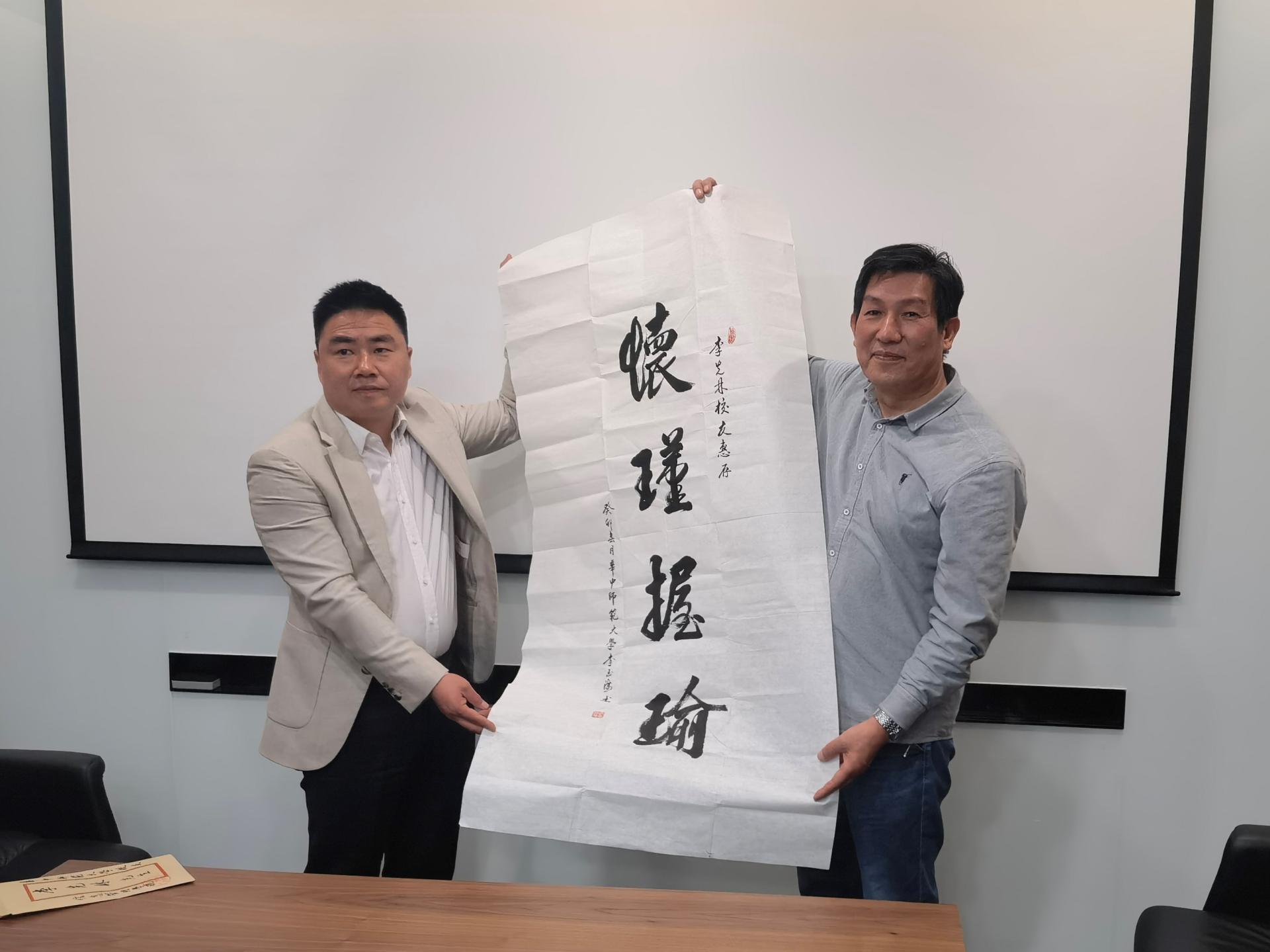 在深圳市盛冠达资产投资有限公司,03级校友李先林、袁夫捷、胡飞分别介绍了自身的创业经历和各自公司发展情况。他们高度评价了学院复合型人才的培养模式,李先林指出,“读书期间专业知识比较广,这为自己在金融行业站稳脚跟奠定了坚实基础”,胡飞对“先就业后择业”非常认同,袁夫捷强调“我们都是在换了几个个岗位,踩了无数坑以后才有了明确的定位”。李玉海对各位校友表示了充分的肯定,并赠送李先林校友“怀瑾握瑜”书法作品,他希望校友们抽时间返回校园看看,走上讲台讲讲,给学弟学妹起到良好的示范带动作用。