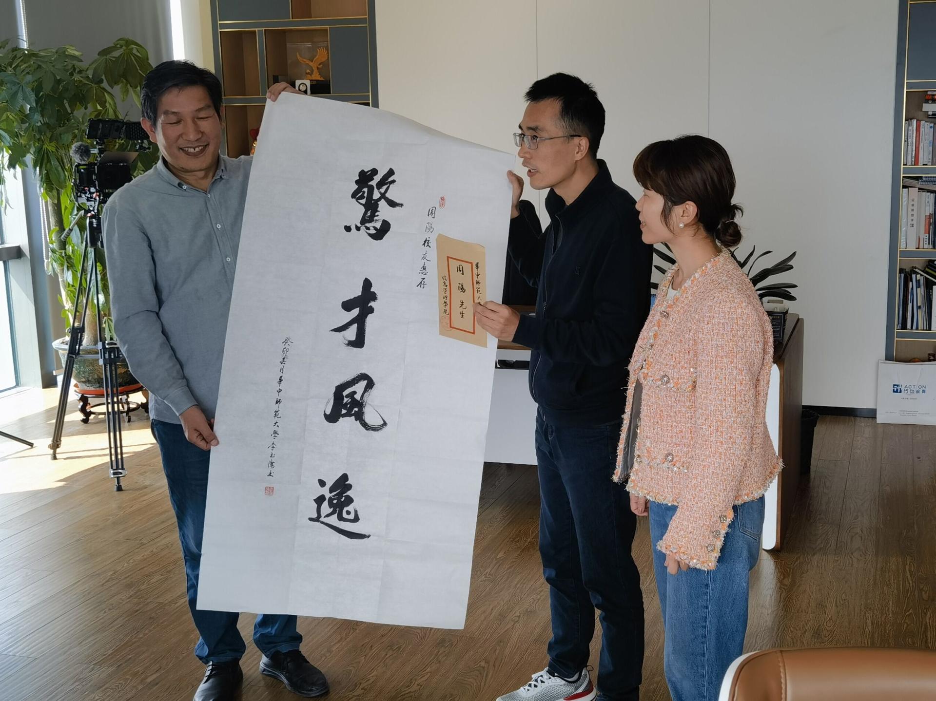 在深圳市乐其网络科技有限公司,03校友周阳、唐小婉热情接待了李玉海一行,他们详细介绍了公司从初创型小企业向定位全球中高端市场、员工近500人的国家高新技术企业发展的创业历程,并带着大家参观了公司。李玉海高度评价了周阳夫妇敢为人先的创业精神,并赠送“惊才风逸”书法作品以示勉励,他对周阳校友能多次返校无偿指导帮助学弟学妹的行为表示感谢,并希望今后进一步加强联系,促进校企联动共赢。