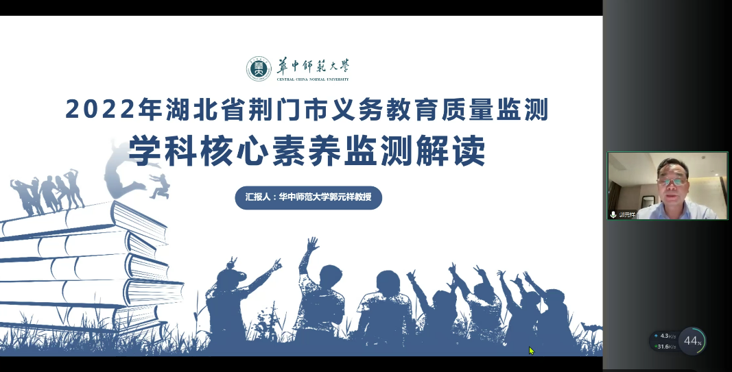 会议第二阶段,华中师范大学专家团队对2022年荆门市义务教育质量监测结果进行解读。华中师范大学教育学院郭元祥教授作为本次荆门市义务教育质量监测工作的首席指导专家,对荆门市核心素养监测总体情况进行结果解读。随后,华中师范大学教育学院伍远岳副教授、数学与统计学学院胡典顺教授、生命科学学院李娟副教授、文学院陈秀玲副教授分别针对一般核心素养、数学核心素养、科学核心素养、阅读核心素养作监测结果解读。