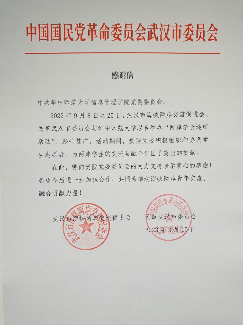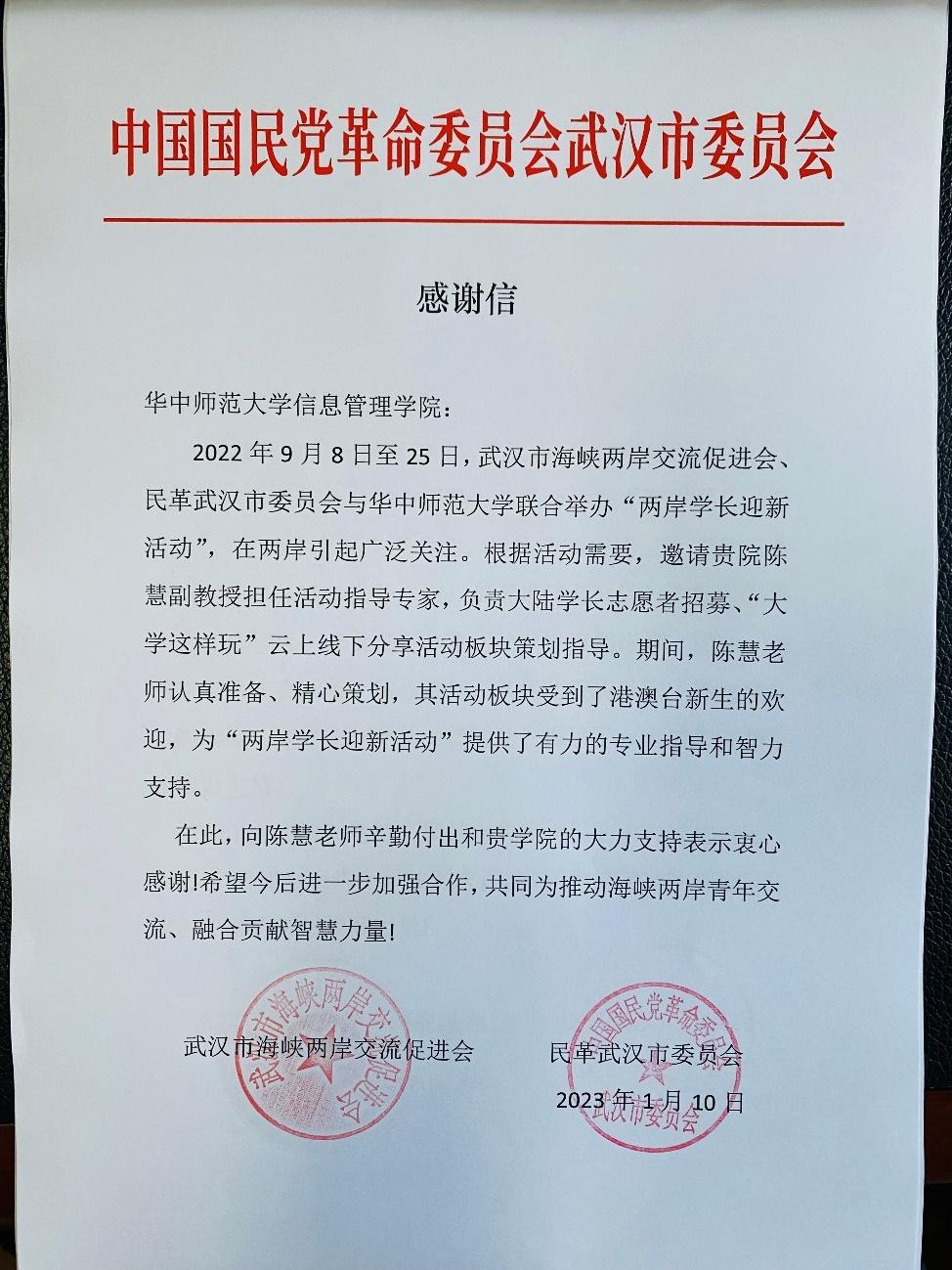 信中对我院在武汉市海峡两岸交流促进会、民革武汉市委员会与华中师范大学联合举办“两岸学长迎新活动”中所做的支持工作表示感谢,并充分肯定了我院陈慧副教授在本次活动中的工作成效。