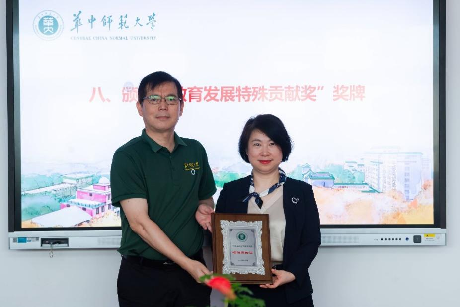 陈迪明副书记代表学校为刘春华董事长颁发了“学校教育发展特殊贡献奖”奖牌。
