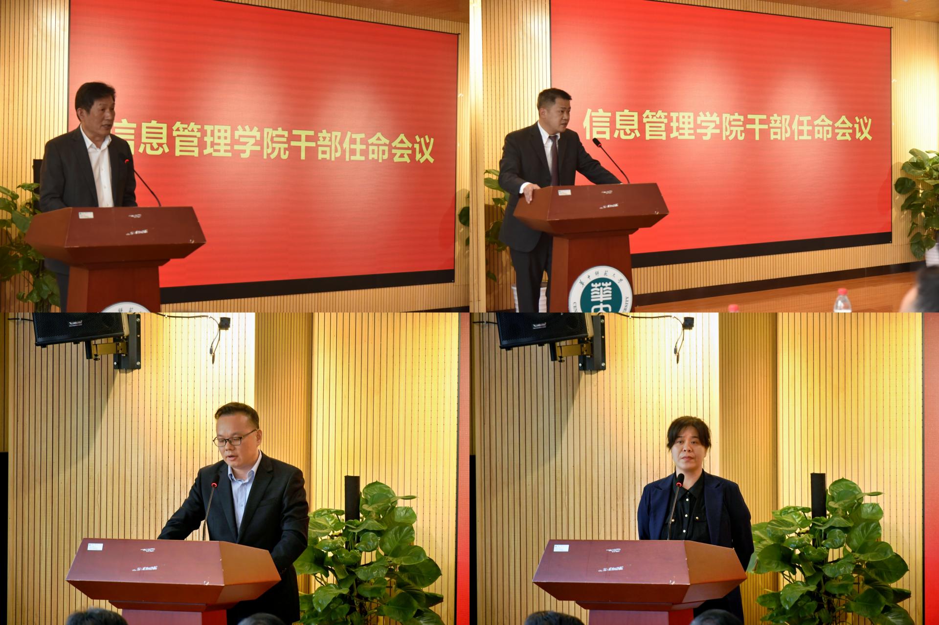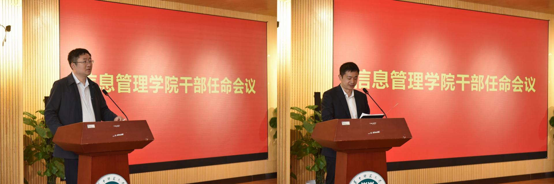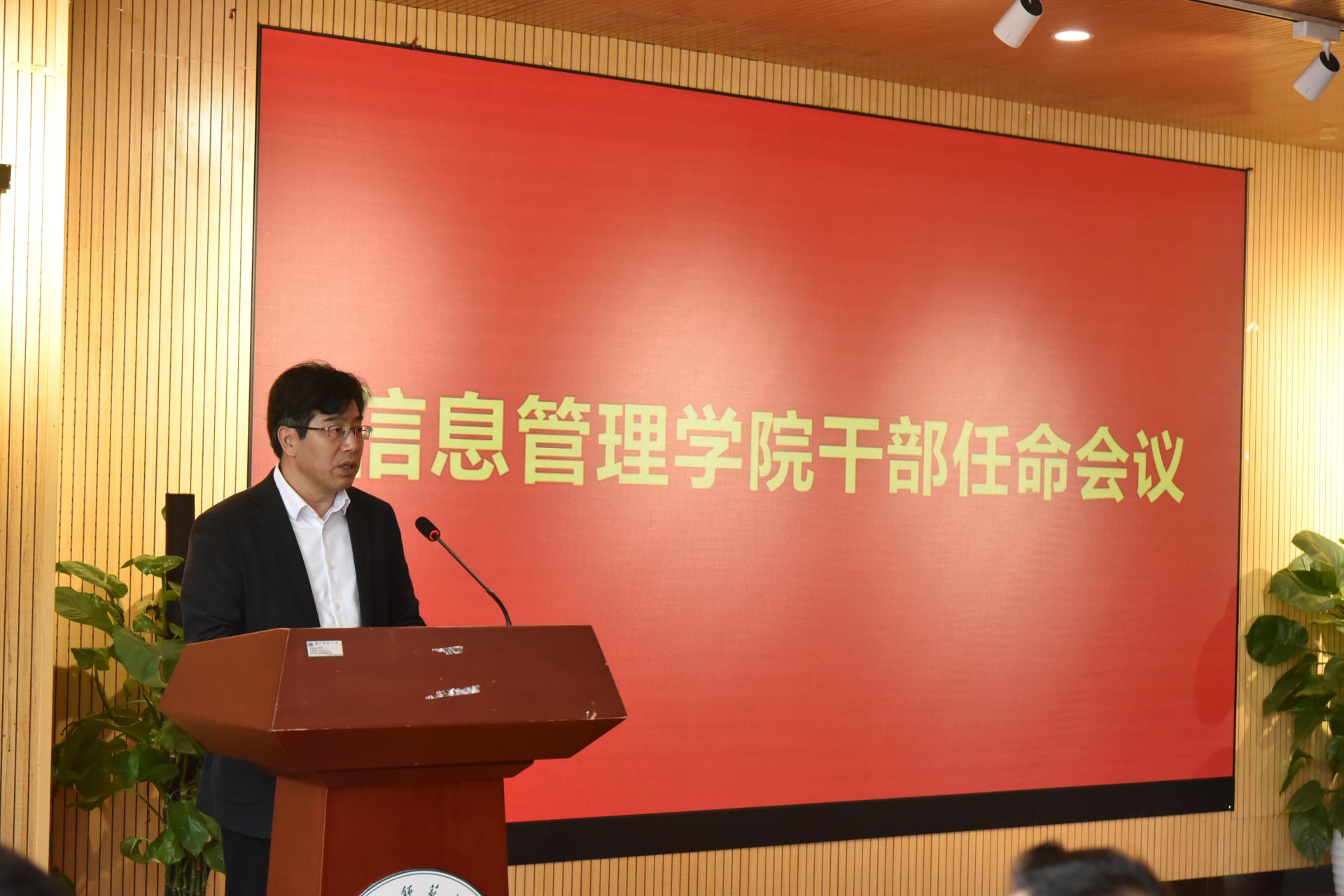党委组织部常务副部长龚炜宣读了《关于曹高辉等同志职务任免的通知》,经学校党委常委会会议研究决定,任命曹高辉为信息管理学院院长、党委副书记,任命易明、翟姗姗为信息管理学院副院长,免去李玉海、曹高辉之前所担任职务。