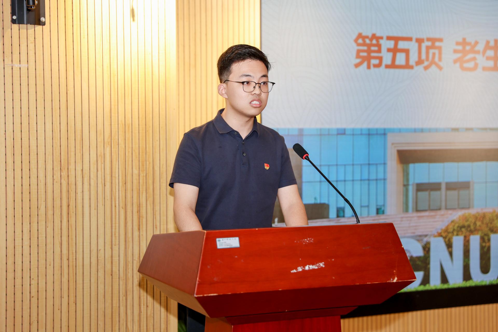 老生代表张进澳发言。他分享了自己在学习科研和生活成长中的感悟,他强调学习科研要埋头苦干、保持初心,同时要加强与老师的交流、与同学的合作。他还提到,新生同学们要向下扎根、向上生长,在成长道路上行稳致远,书写自己精彩篇章。