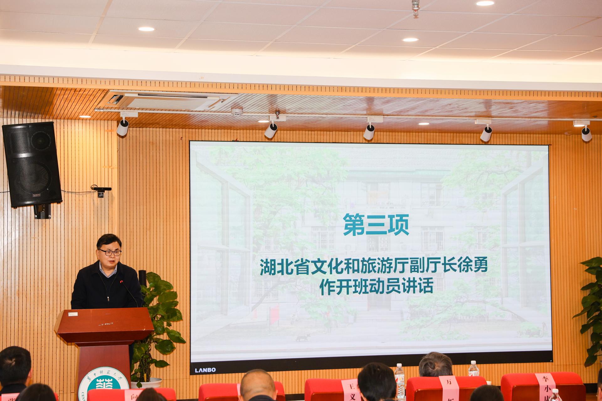 12月2日下午两点半,培训班开班仪式在华中师范大学信息管理学院南湖综合楼10001报告厅举行,由华中师范大学信息管理学院党委书记王雨露主持,华中师范大学党委副书记陈迪明致欢迎辞,湖北省文化和旅游厅副厅长徐勇作开班动员讲话,班主任尚潇雨宣读学员学习纪律。