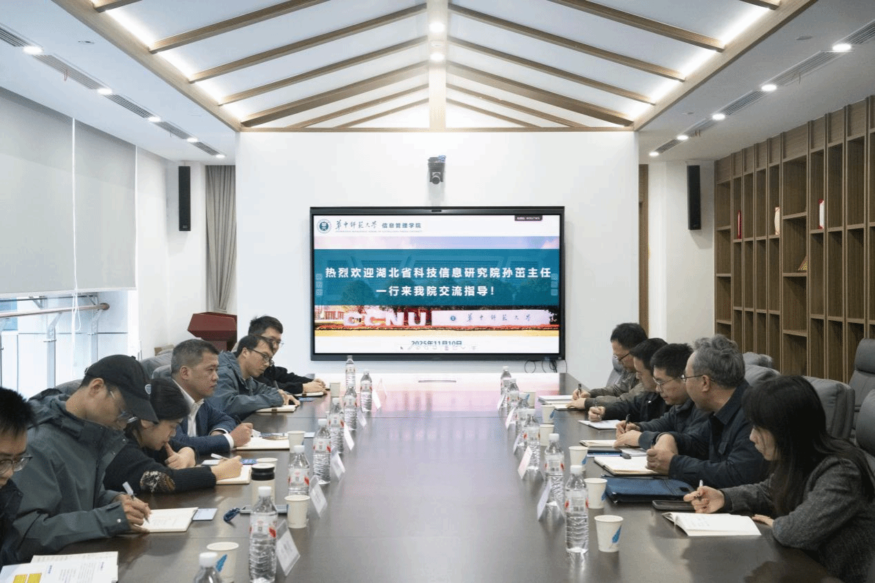 (通讯员 车昀泽 李梦迪)2025年11月10日,华中师范大学信息管理学院与湖北省科技信息研究院科技查新情报服务中心召开产业创新合作研讨会。湖北省科技信息研究院科技查新情报服务中心主任孙茁、总查新师王章红、副主任吴德胜、专技人员黄维等出席座谈会,学院领导及教师代表围绕产学研深度融合展开深度交流。