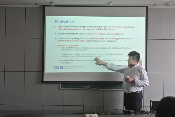 信息管理学院讯(通讯员宁丹)5月25日下午,哥本哈根商学院IT管理系副教授、博士生导师、MIS Quartly副主编陈致玮应邀到我院922作了一场题为“The Art of Online Foraging: Adaptive Search in Consumer-Generated Content Environments (信息搜寻的艺术:消费者自生内容环境下的自适应搜索)”的专题讲座。我院吴建华、张自然、董庆兴、高劲松等老师及各级博士、硕士研究生参与了讲座。讲座由卢新元主持。