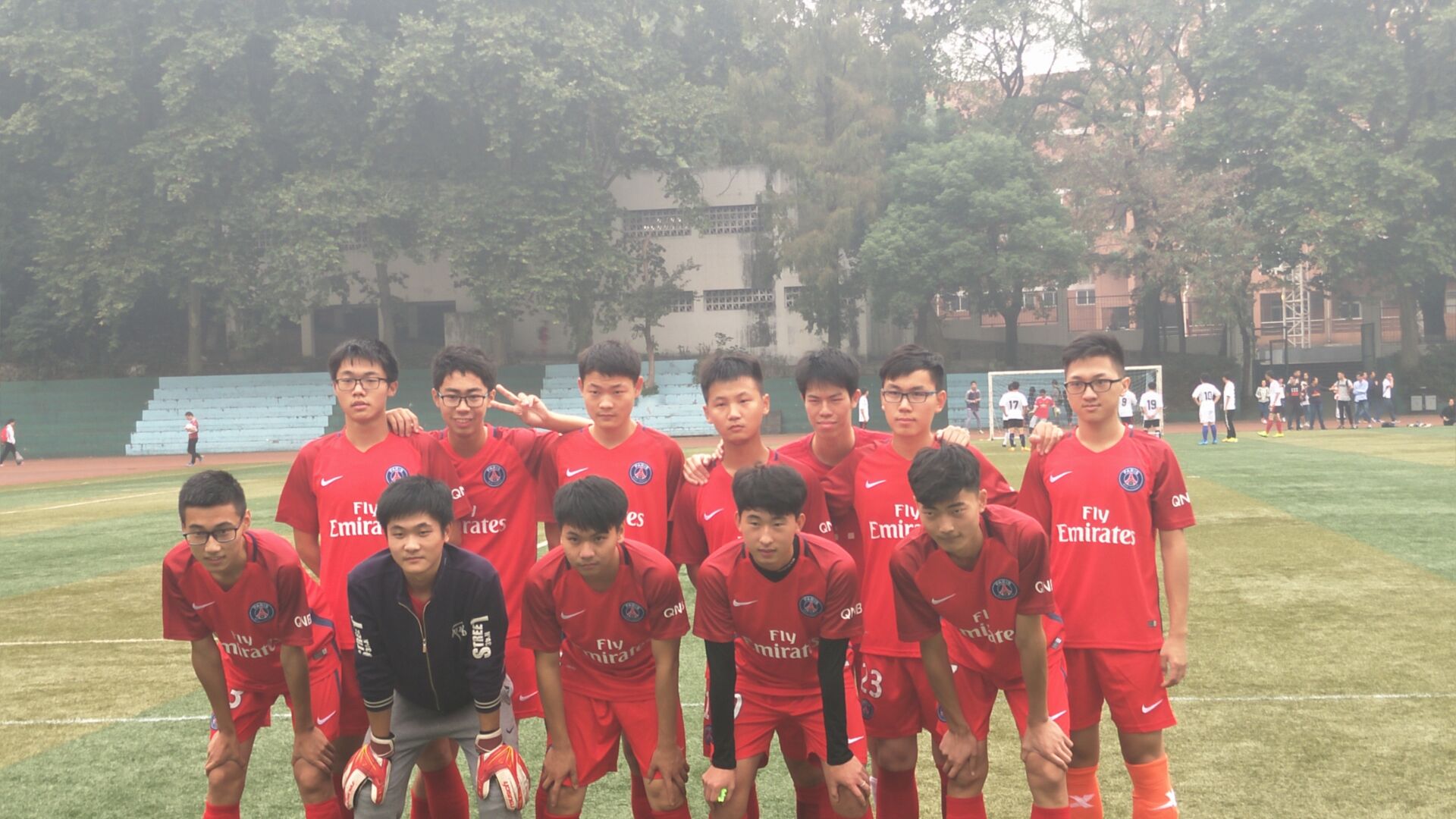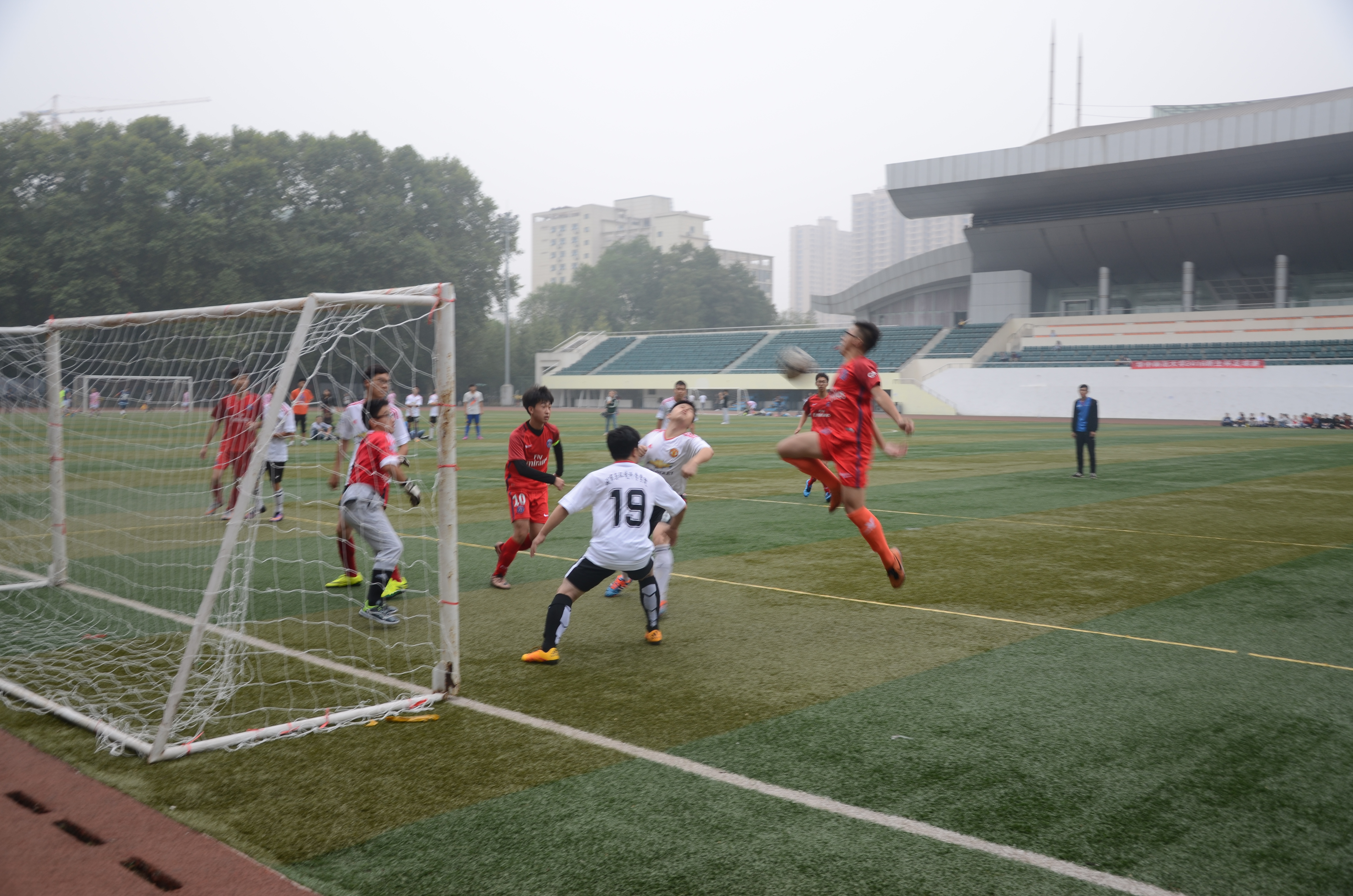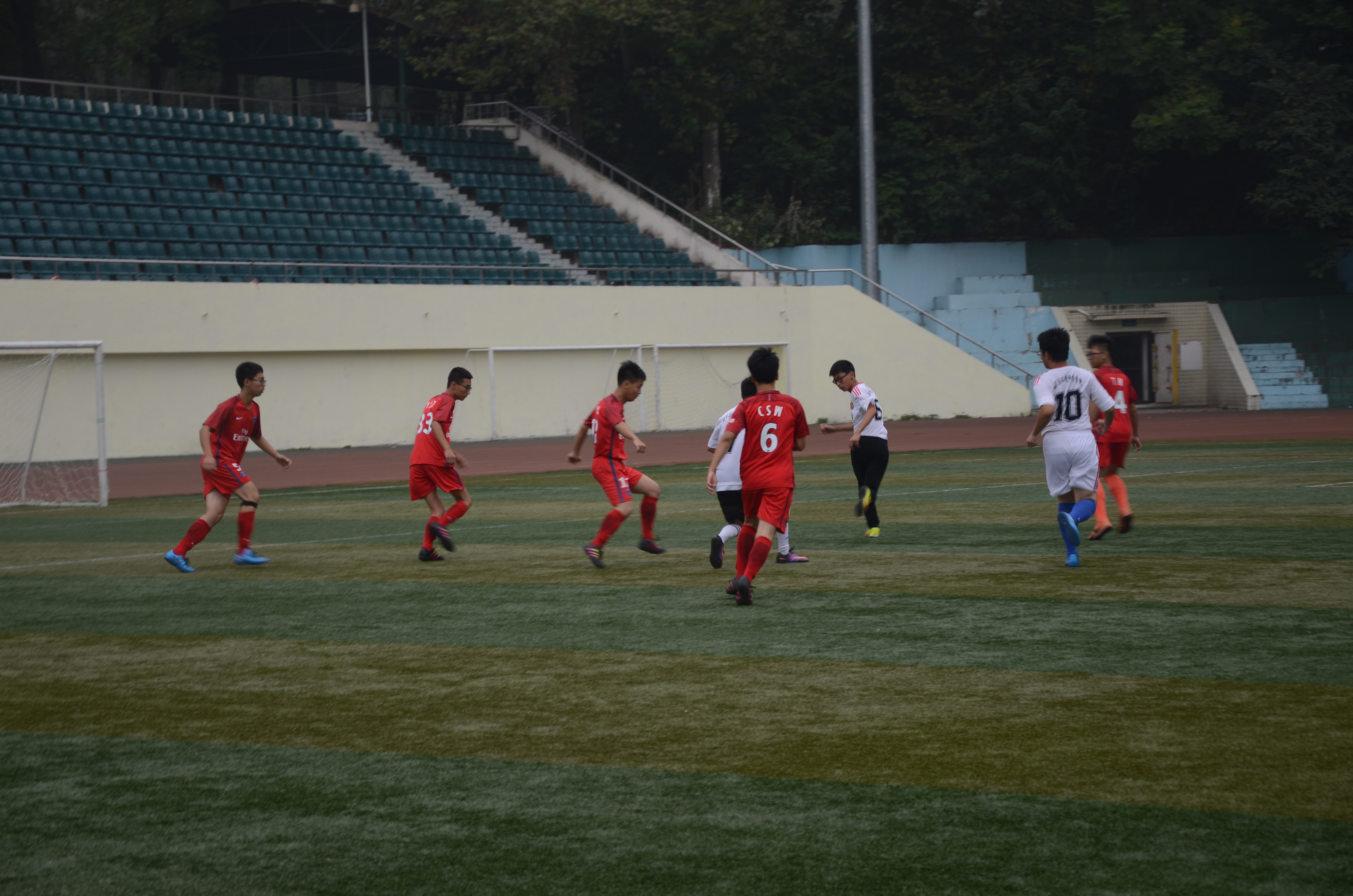 ,"新生杯"足球赛男子组,信息管理学院与城市与环境科学学院的战役打响。信管队员身着红色球衣,城环队员身着白色球衣。红队在队长徐港的带领下以四比二的好成绩战胜白队。