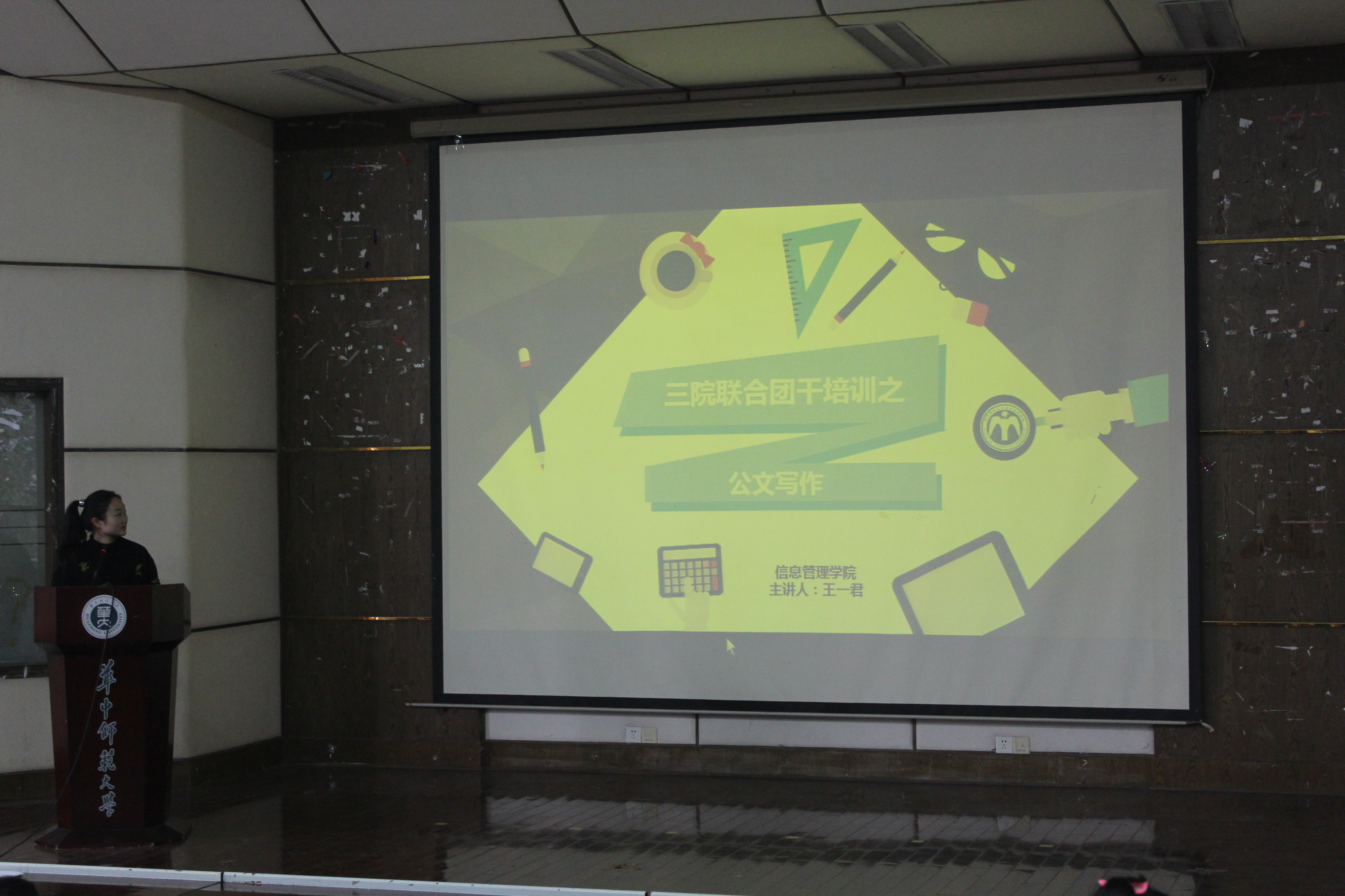 (通讯员韦岳良孙苗苗)10月22日下午两点整,华中师范大学信息管理学院、外国语学院、计算机学院联合举办的团干培训第三期在学校九号楼一楼报告厅开讲。参与本次培训的有信息管理学院、外国语学院、计算机科学学院的主要年级干部,主讲人是信息管理学院14级学生王一君。