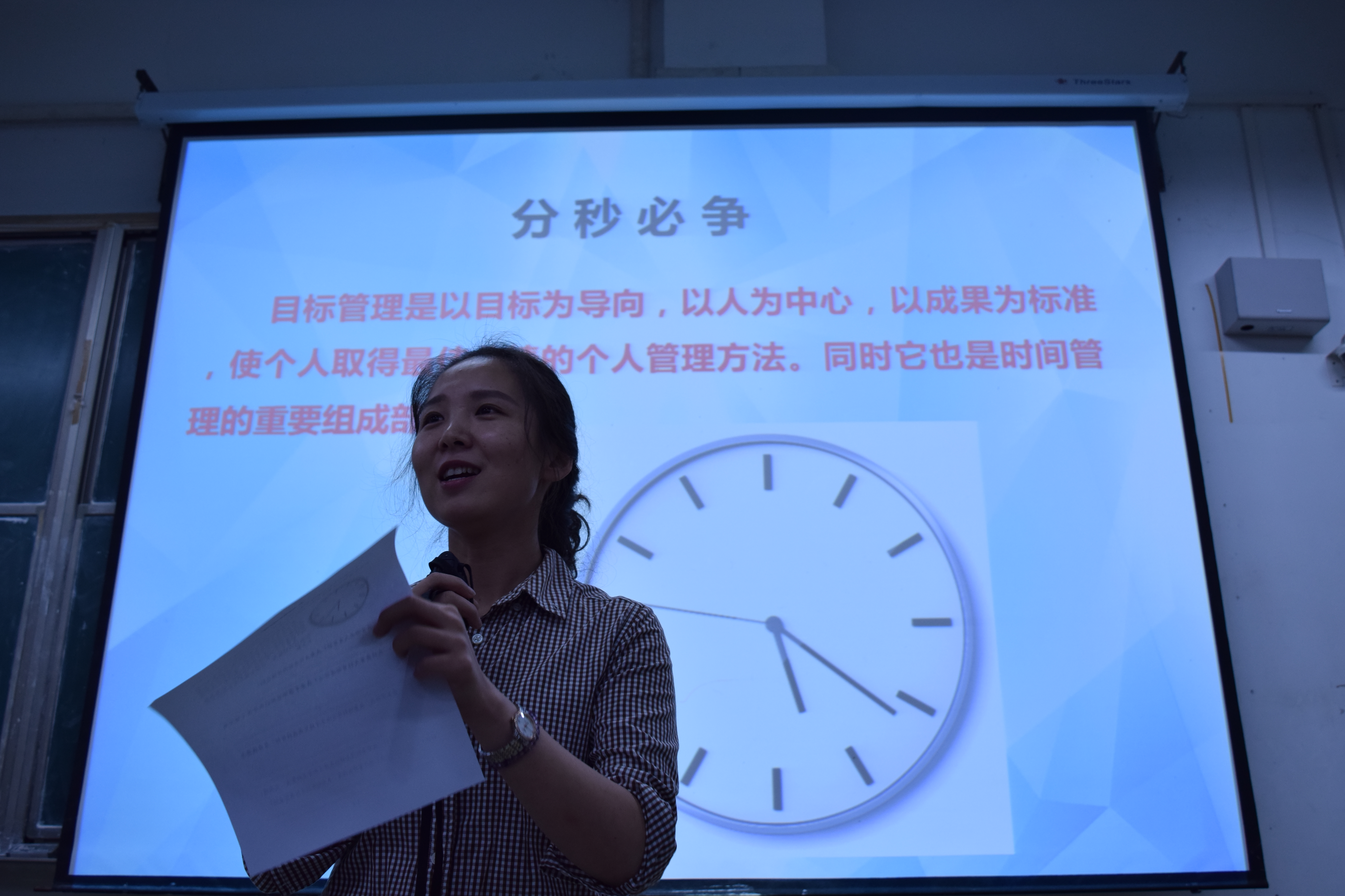 一张标题为“分秒必争”的问卷。问卷中对人身目标设问较多,旨在让同学们时刻明确自身目标,学会规划并管理自己,懂得珍惜时间。她还列举电视剧经典桥段并现身说法,让同学牢记:永远不要考验自己的人性。