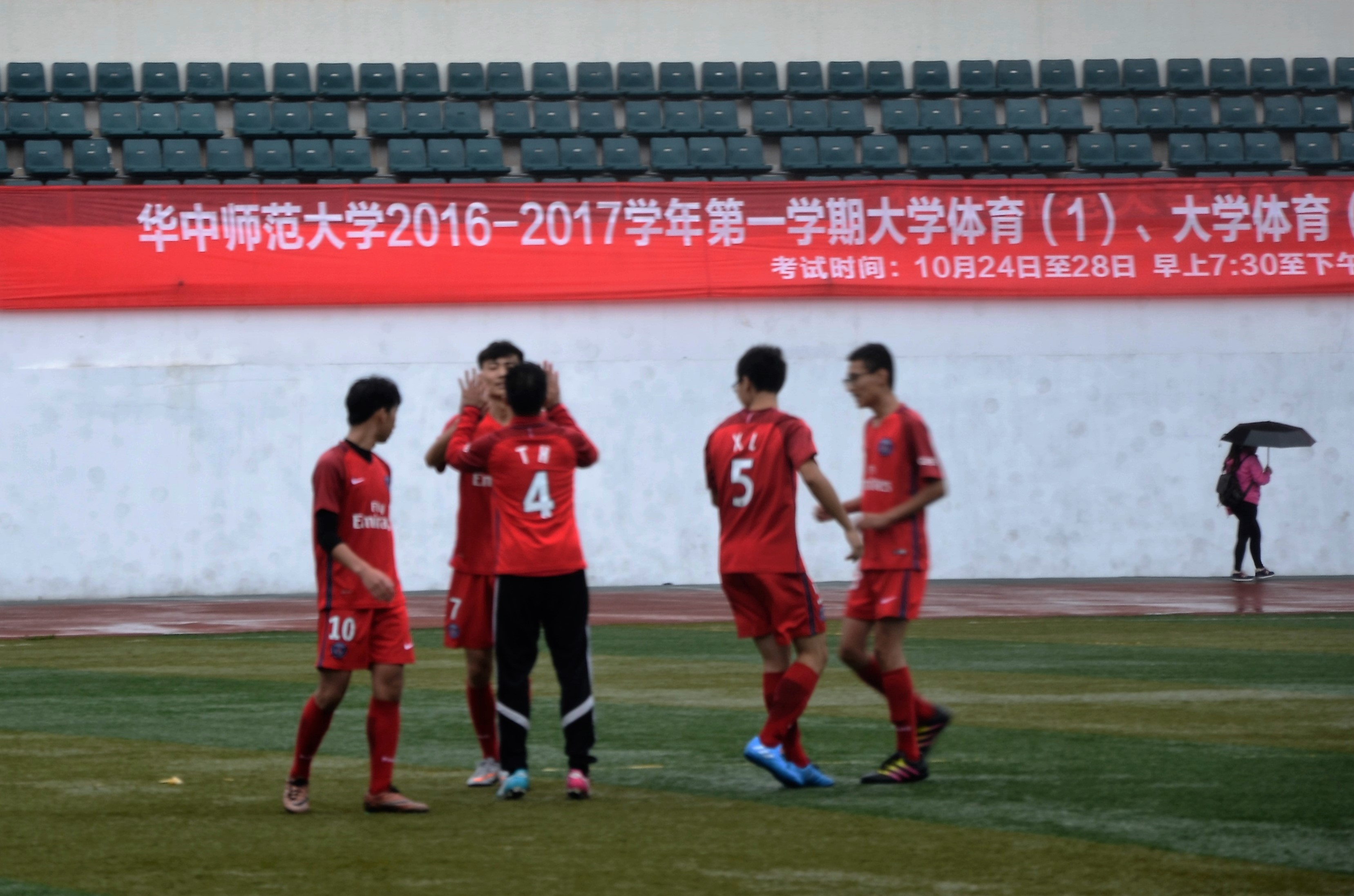 中午12:25,华中师范大学“新生杯”足球赛男子组比赛于佑铭体育馆南区顺利举行。经过激烈角逐,信息管理学院以1:0战胜音乐学院。时虽伴有小雨,双方队员激情拼搏、以球会友的精神面貌却并没有受到影响。