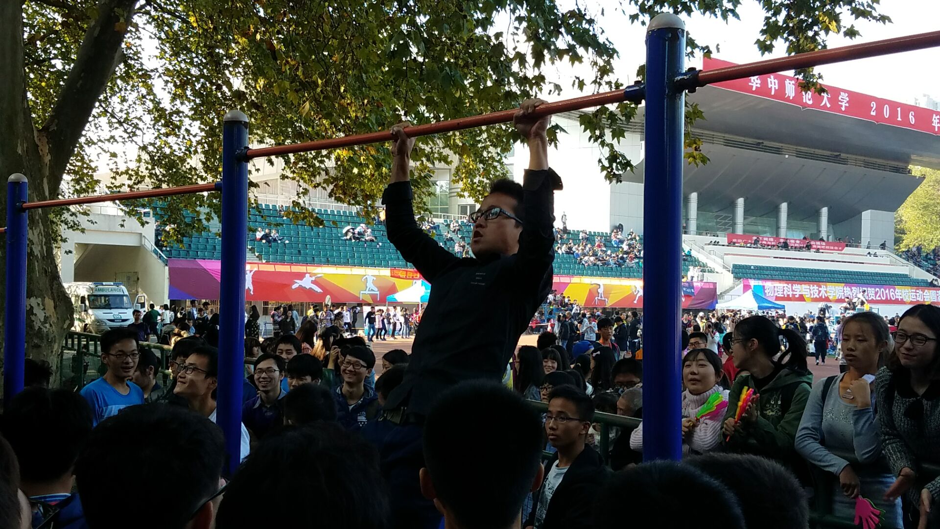 下午两点以前,信息管理学院挑选出的二十名引体向上参赛选手便早早在佑铭体育场西侧候场。随着主裁判员一声令下,各院运动员鱼贯上杠,午后的第一场比赛就此打响。观赛的学生围满了西侧的比赛场地,加油助威声、鼓掌喝彩声彼此交织,无形中成了参赛选手的一大助力。据2016级体育部长徐虎介绍,比赛时各位参赛选手不俗的表现,与运动会前的积极准备密不可分。