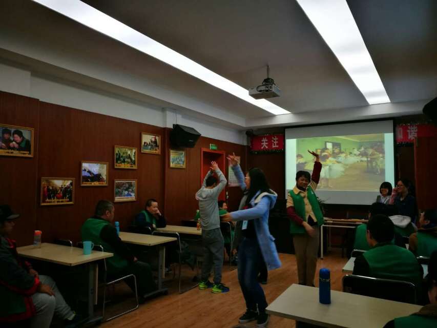 当所有的紫阳街阳光家园的残疾人朋友都到场后,志愿者的活动也正式的开始了。活动主要由三部分组成:第一部分是志愿者们与残疾人朋友的进行自我介绍的环节;在这个环节中,志愿者们都表达了希望可以跟各位残疾人朋友在志愿活动中共同学习、一起成长的美好意愿,还为自己取了容易记住的小绰号,也赢得在场残疾人朋友的热烈掌声;第二部分是由志愿者来为在场的残疾人朋友介绍一副世界名画,介绍的具体内容包括:这幅图画中人物的动作、形态以及一些实用的绘画技巧等,在教学过程中,志愿者还亲自为残疾人朋友示范了图画中的芭蕾舞动作,还在现场邀请了残疾人朋友一起站起来模仿,在整个教学过程中现场充满了欢声笑语,志愿者与残疾人朋友也在热闹的氛围中逐渐打破了陌生的隔阂。