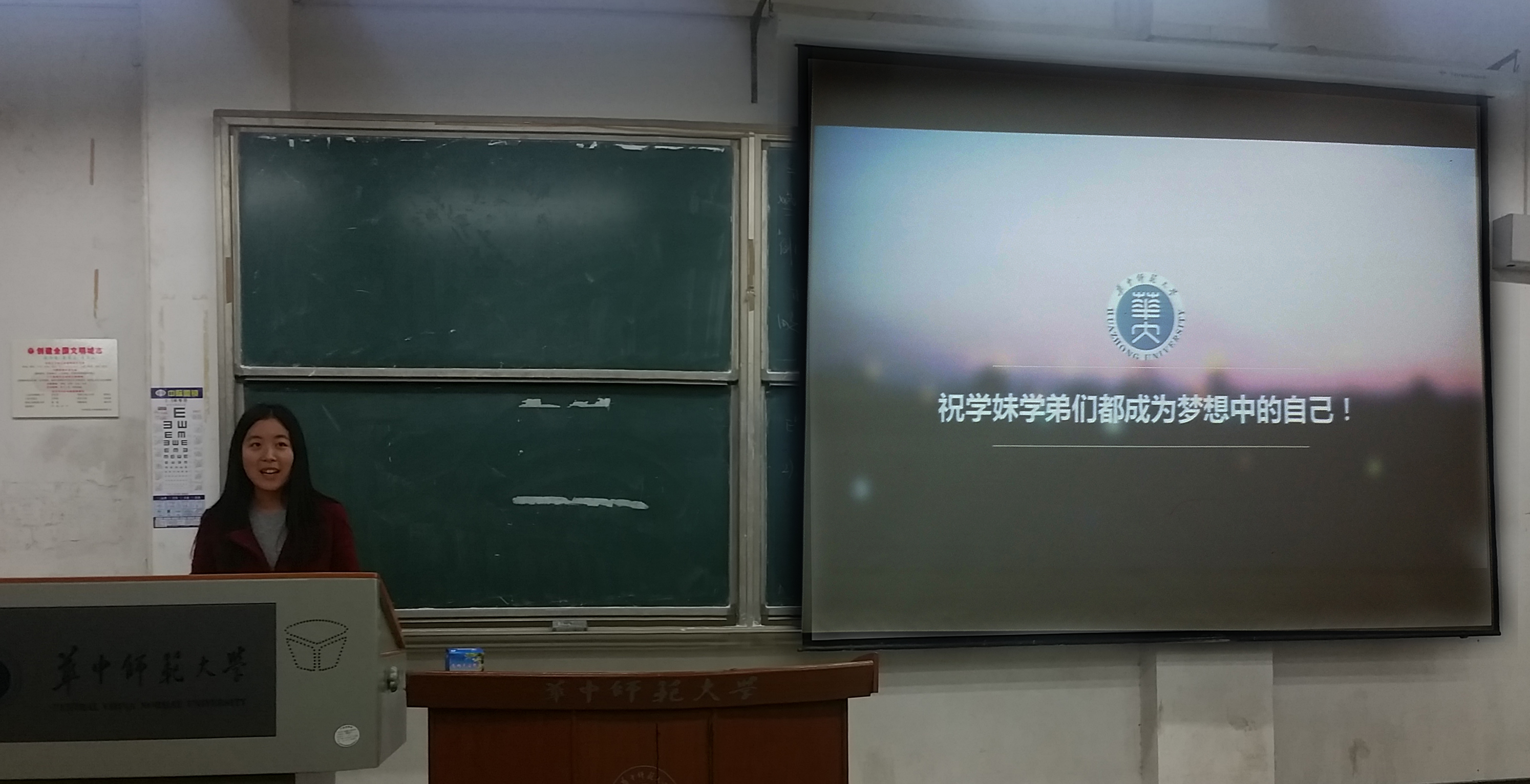 分享会开始前,蒋可鸣老师向大家介绍了李京蔚学姐,付婷学姐的专业以及毕业去向,介绍了叶彩玲学姐的工作去向。
