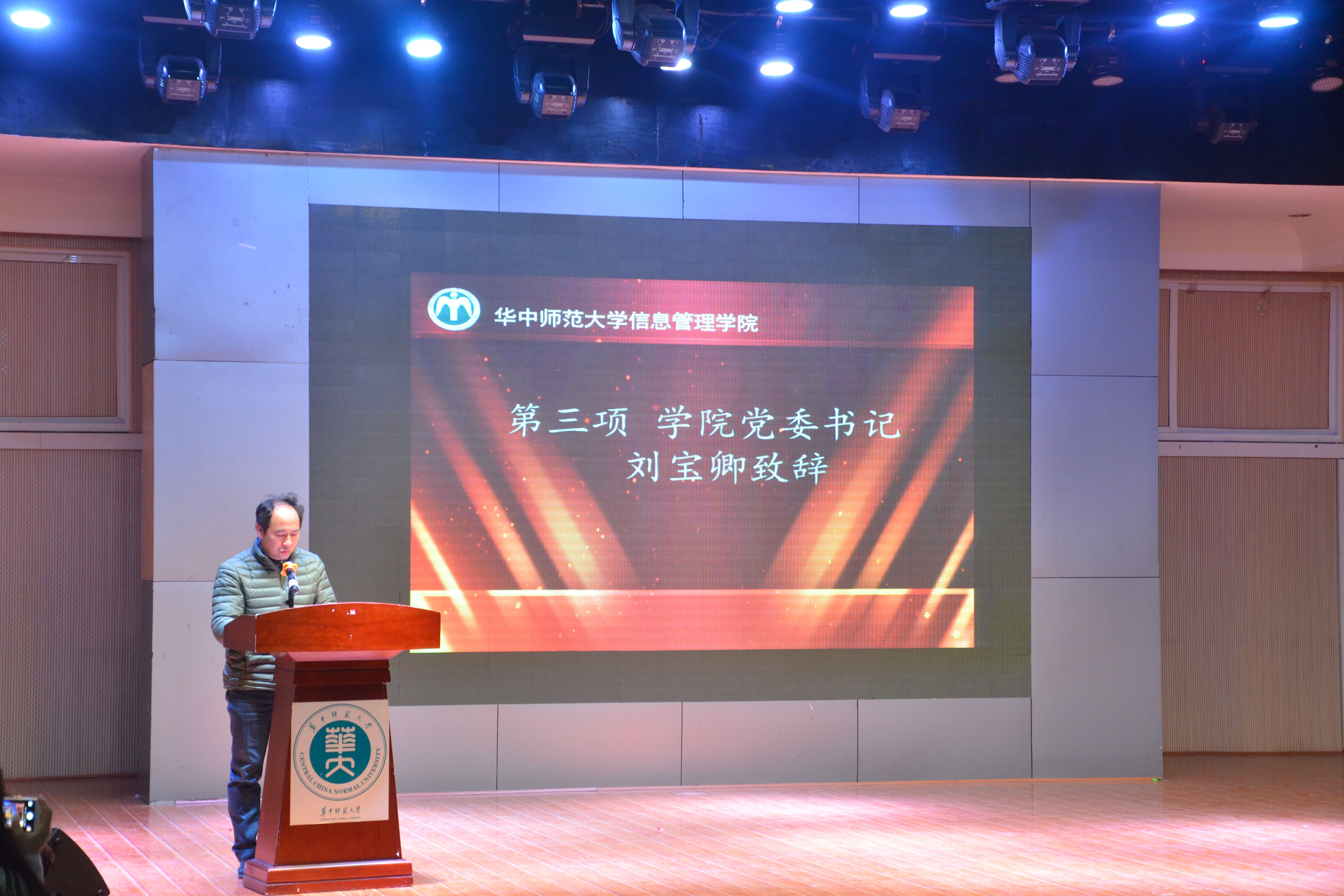 在全体起立奏唱国歌后,大会以一段视频展现了2016年度“信管之星”优秀团队及个人的风采。随后由学院党委书记刘宝卿致辞,他介绍了我院把思想政治工作贯穿教育教学全过程,坚持“以生为本,为学生成长成才提供全方位的优质服务”的学生工作理念2016年度在学生工作方面所取得的成绩,此外,他还对大家提出了学会自省、学会感恩、学会律己,提升自身竞争力迎接新的竞争和挑战的希望及要求。接着学院院长夏立新教授宣读了《关于表彰2016年度“信管之星”领军奖先进个人、先进团队的决定》。