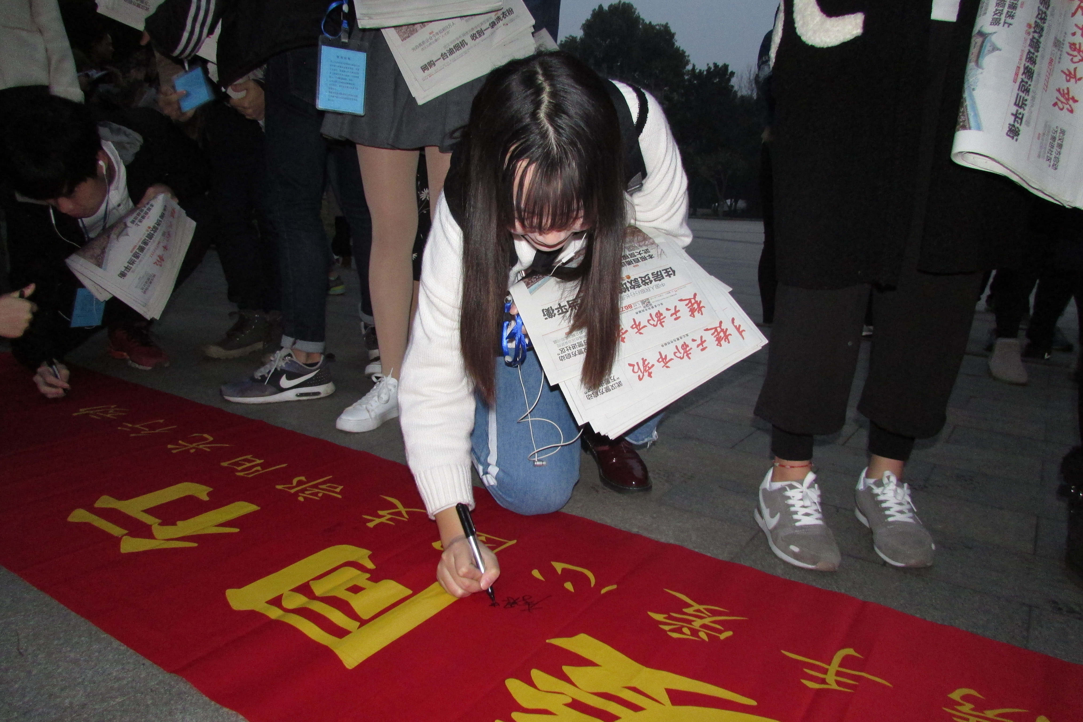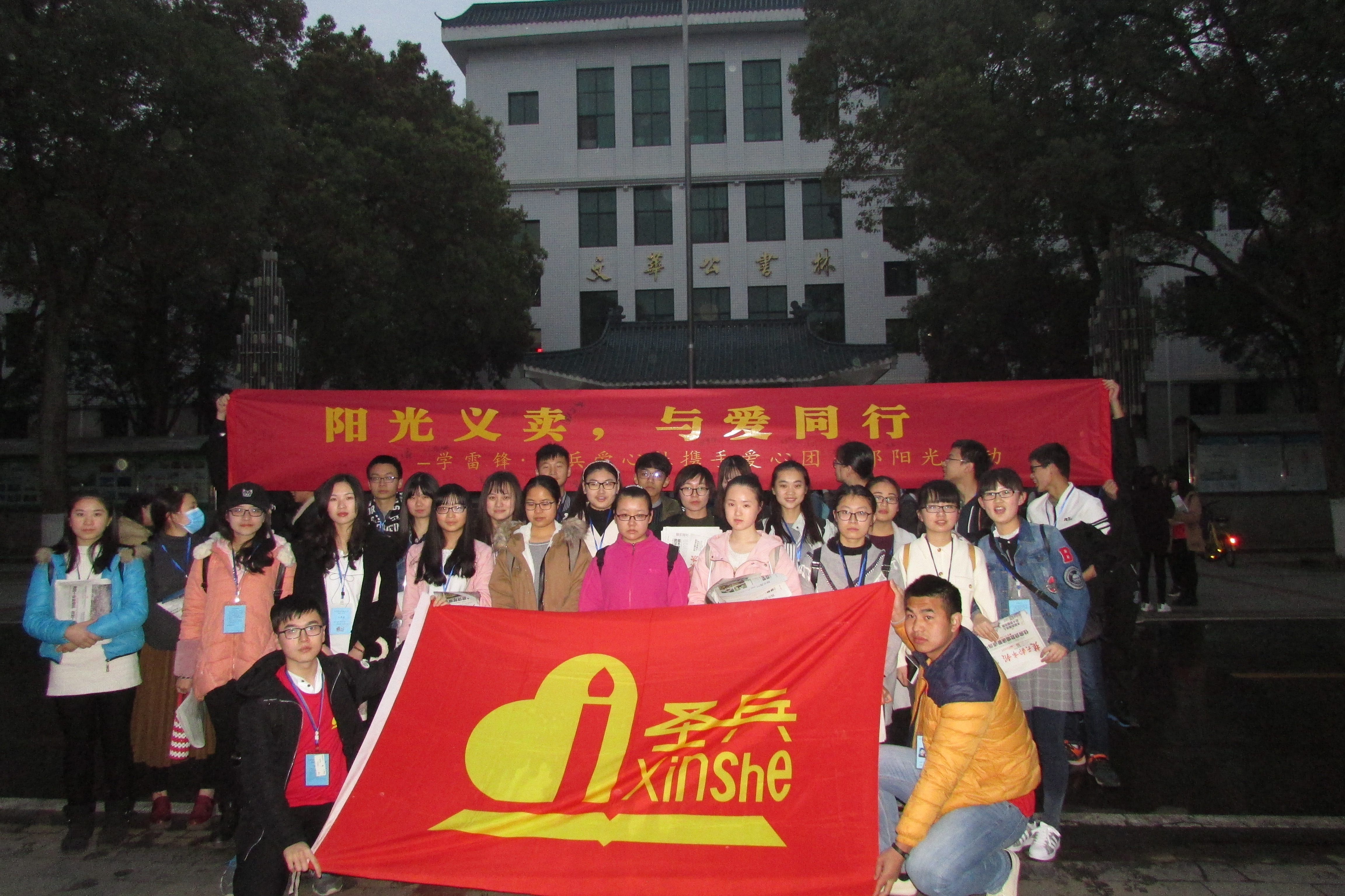 六点三十,1603班全体成员在华中师范大学喷泉广场集合完毕。本次活动的总负责人向大家交代了注意事项和活动范围,并且组织大家在“阳光义卖,与爱同行”的横幅上签字表达信念。这让同学们精神振奋,迫不及待的去进行“以报传情”。