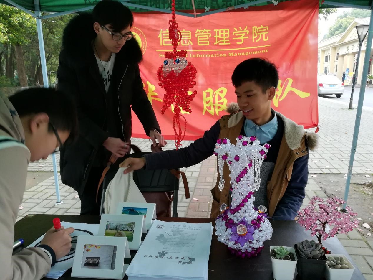 我院青协于3月17日全天在东区小树林展示了“微公益”活动中的部分义卖品,以赢得广泛关注。参展义卖商品来自我院青协所属华信服务队服务点紫阳街阳光家园,为残疾人手工艺品。商品展示的同时,华信服务队队员开展简单的游戏,赠送礼物盆栽,进而宣传微公益的线上捐物、购物流程。