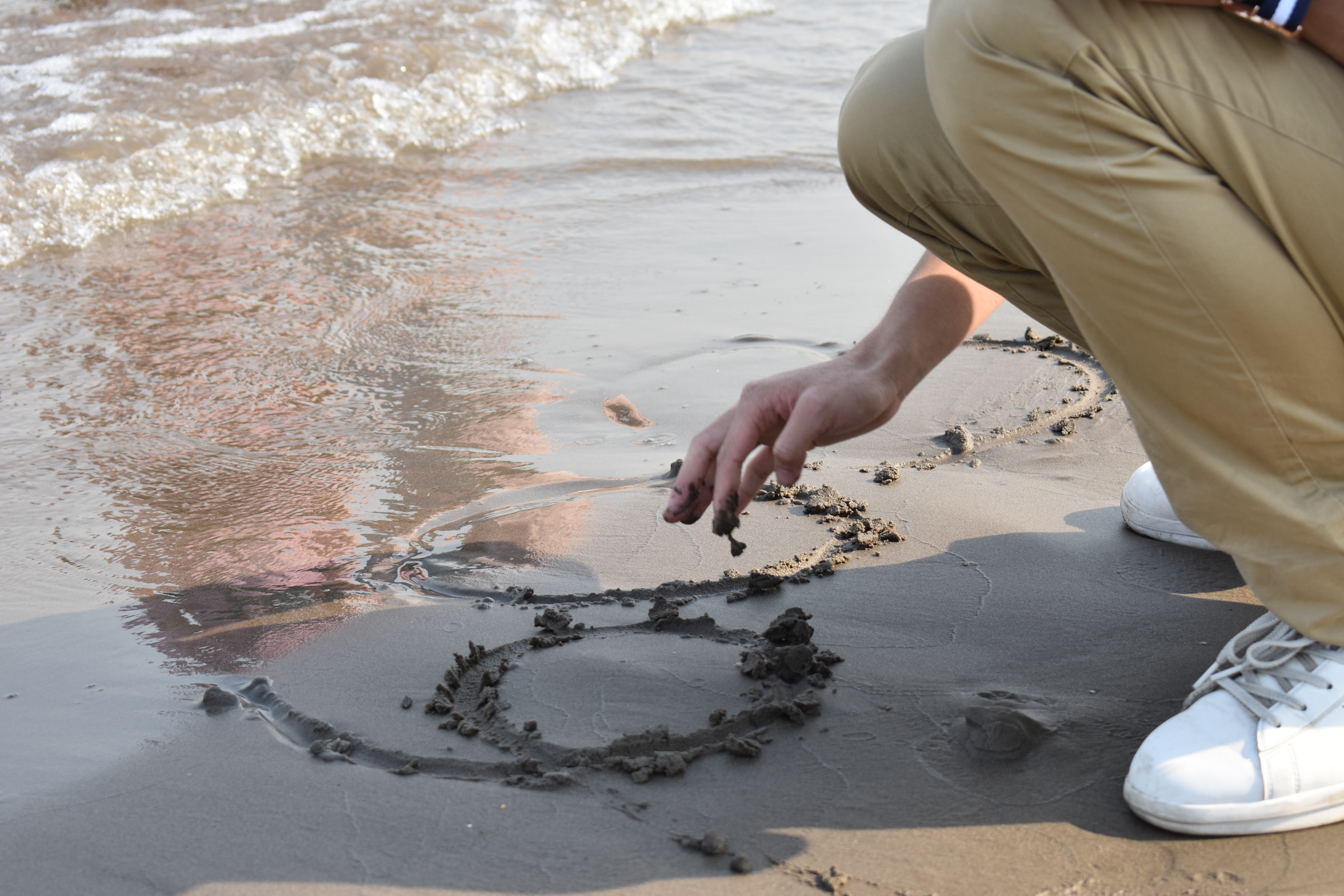 看着柔软细腻的江沙,周枫然同学蹲下身来,用手指在沙上缓缓写起了字,或许这字会被冲卷而来的江水带走,但对祖国土地的热爱和这份属于青年的思索应会留存在他的心里。杨悦同学和陈秋阳同学在江边并肩散步,并不时拍照留影,相机记录下两位同学的青春脸庞,也记录着属于青年的纯真友谊。