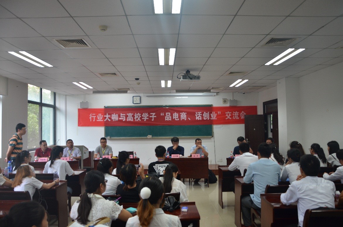 分组比赛结束后由武汉火凤凰云计算服务股份有限公司技术副总裁彭俊杰、汉购网总经理沈若、湖北智慧阳光电子商务投资有限公司合伙人吴叶枫、汉口北进出口服务有限公司总经理徐建峰、武汉杰士邦卫生用品有限公司电子商务总经理周密,武汉淘宝商学院院长助理刘必伟,武汉市农业电子商务协会会长刘殊,湖北邮政EMS市场部总经理廖利军8位企业评委与参赛选手进行“行业大咖与高校学子‘品电商、话创业’交流会”,直面参赛学生,结合各自经历、企业背景及参赛项目特色,与学生就电子商务、互联网+、创新创业等话题展开探讨。