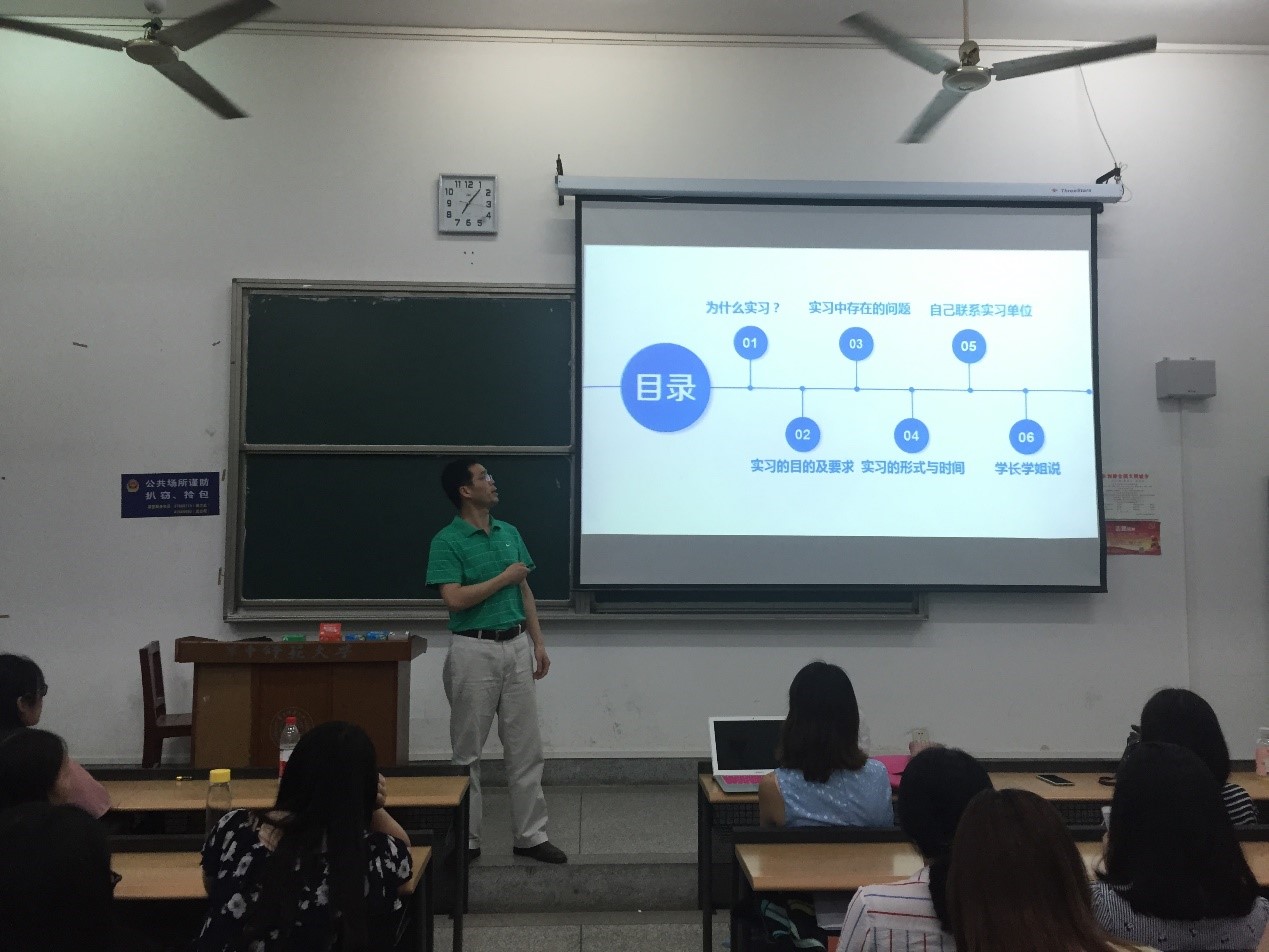 接着,两位2013级的学长学姐进行经验分享。保研的周佳莹学姐分享了她的实习经历与心得,介绍了实习的单位,个人的感悟,如何分析个人的因素去找实习单位,并且向大家提出了对于出国,考研,就业不同的方向做出实习与规划的建议。被联想录用的向玉凡学长向大家介绍了实习制度与需要递交的材料,展示了他的实习报告模板,以及实习中他个人的体会,建议大家注重发展自己的个人能力。