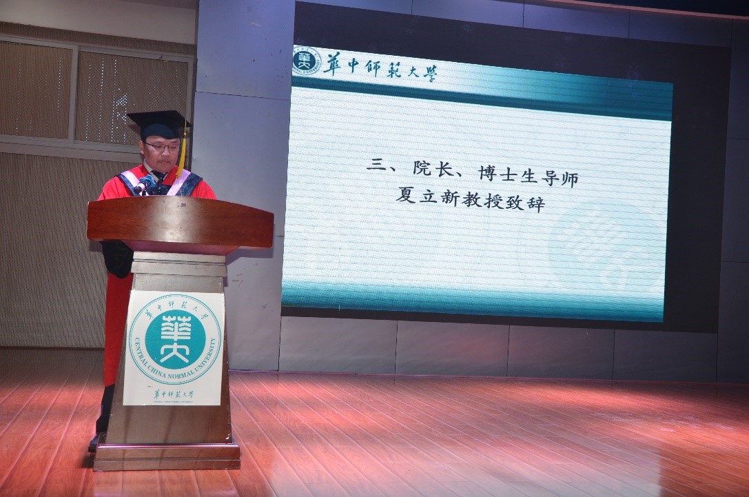 典礼开始,全体起立,奏唱中华人民共和国国歌。礼毕,院长、博士生导师夏立新教授代表学院致辞,他首先向在座的毕业生们正式宣布:“你们毕业了!”随后对同学们在校期间取得的成绩表示肯定,并对大家今后的人生发展表示祝福。他表示,无论大家去往何方,学院都会一直牵挂着大家,并欢迎大家常回母校看看。