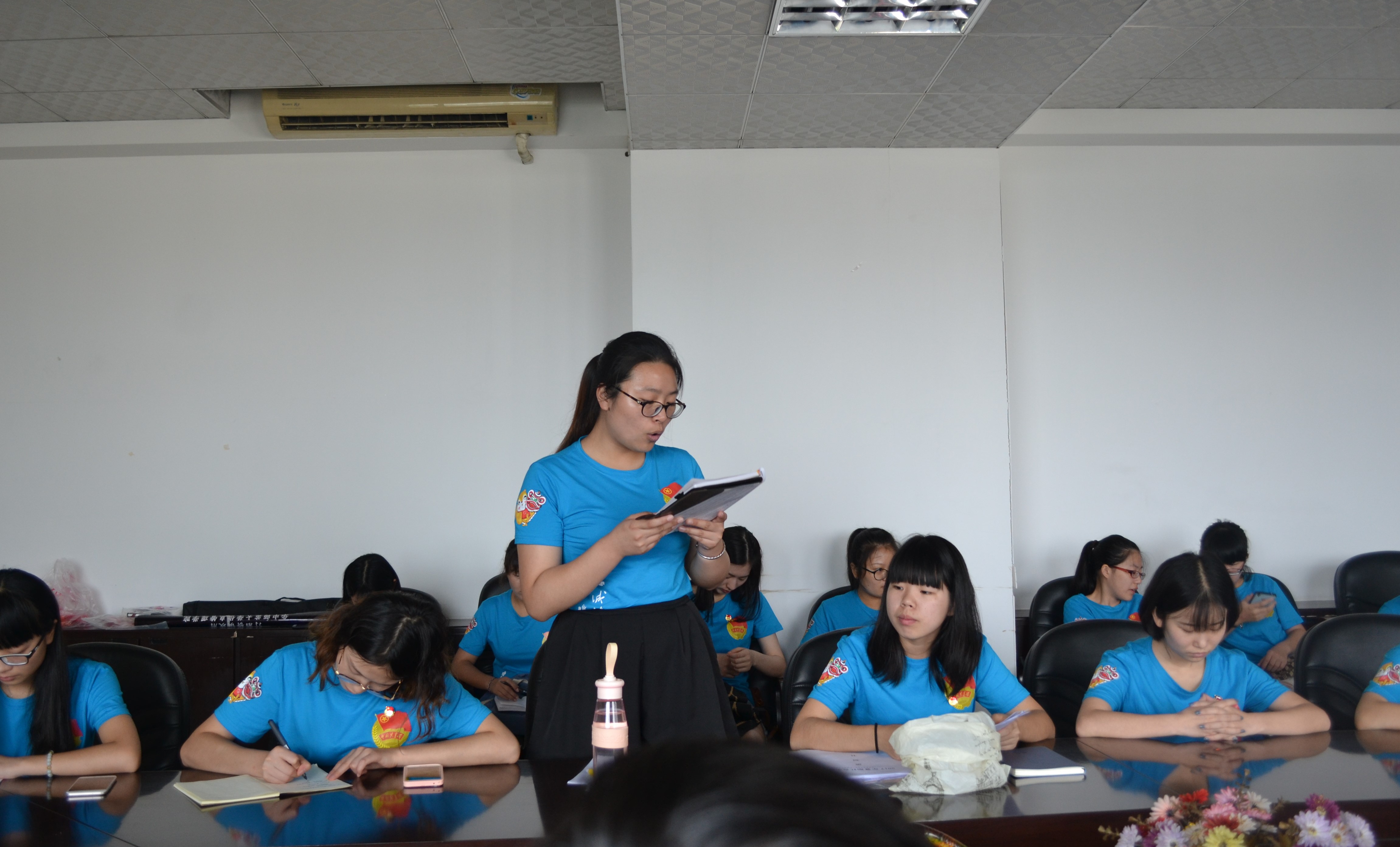 仪式第二项,由社会实践队队长刘星月发言。她围绕“四个保证和四点期望”表达作为本次实践队队长的责任和担当,并不断强调安全问题的重要性,希望队员们以安全为首要前提进行实践调研活动,提醒队员注意自己的财产和饮食卫生安全。同时在整个活动中也希望队员加强团队意识,相互包容,营造良好的团队氛围。接着,由咸宁实践队、神农架实践队各负责人再述团队内部分工分组情况。