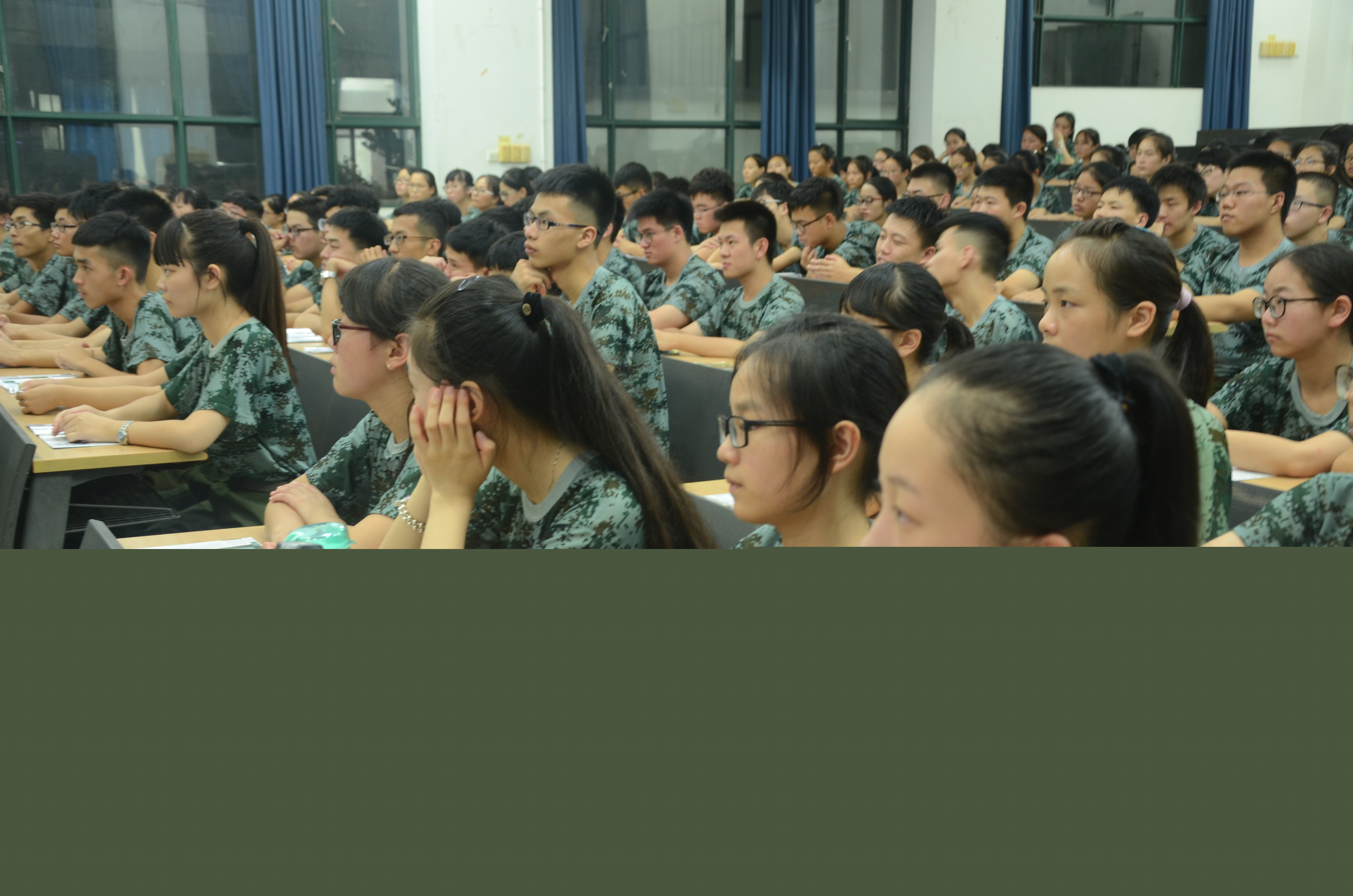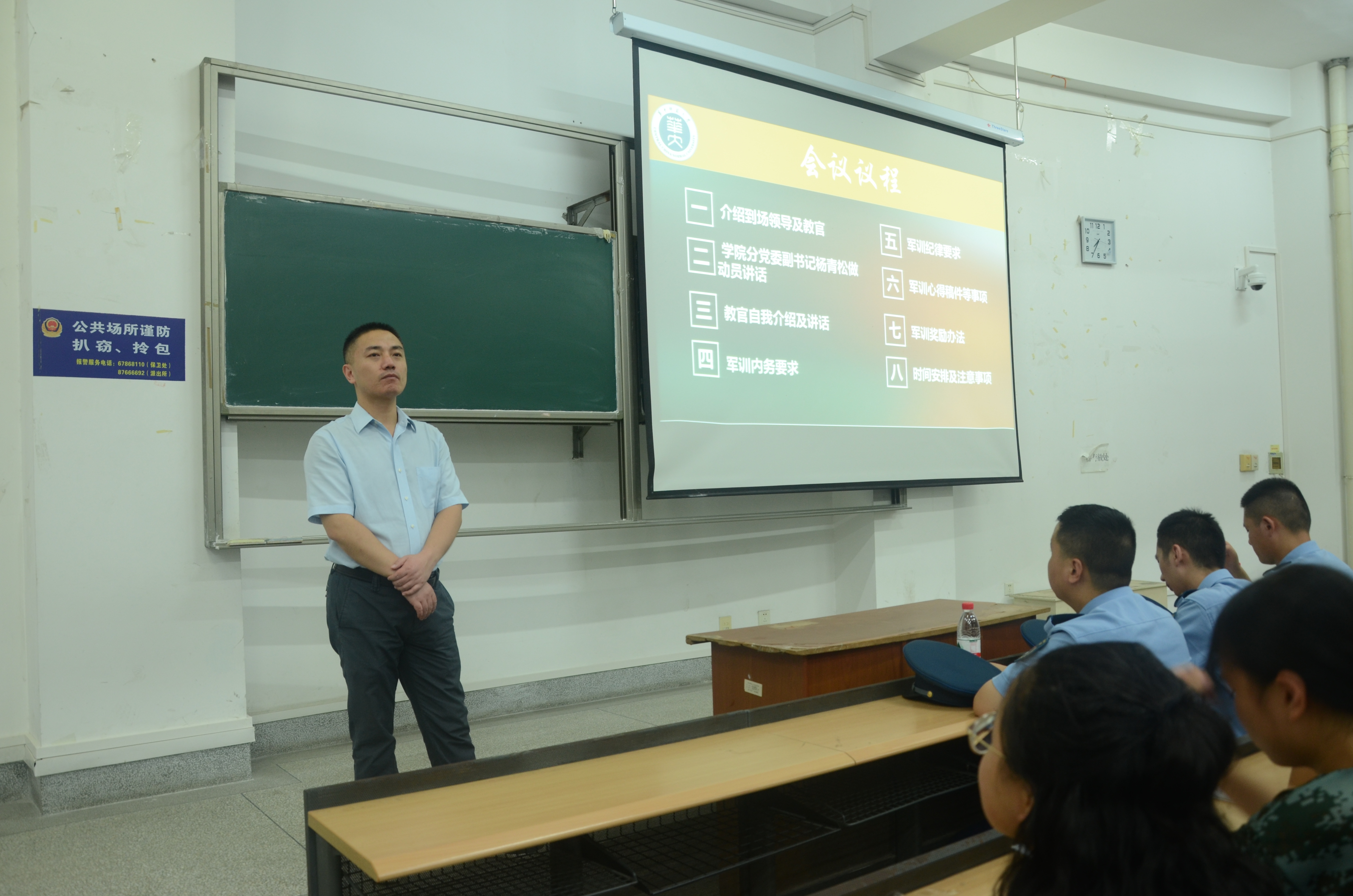 大会第三项,教官进行自我介绍及讲话。教官首先表示在军训期间思想方面一定要庄重,一定要严肃而认真的对待并强调军训是进入大学社会的第一道门槛。其次强调新生要刻苦训练,努力克服军训期间的困难。