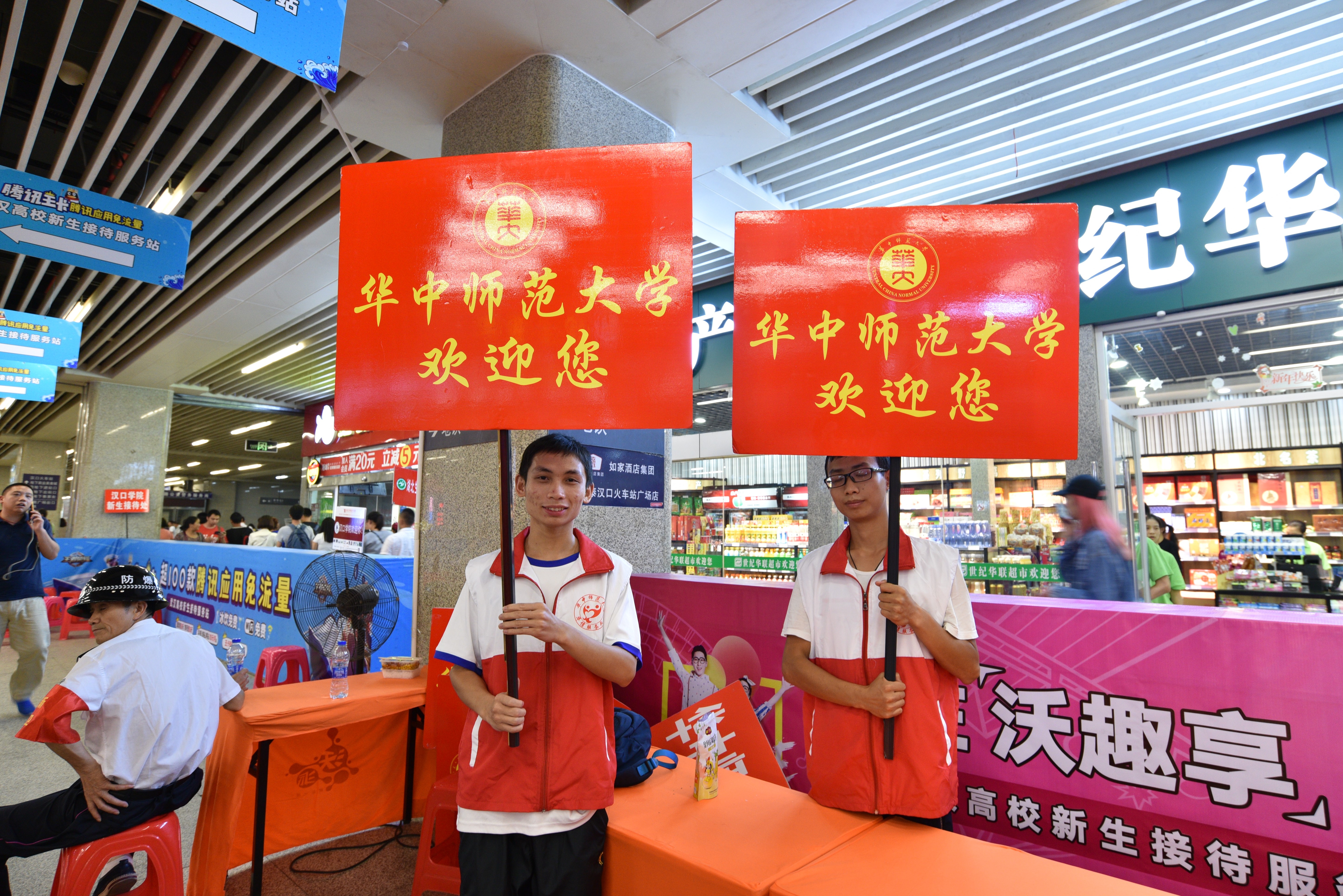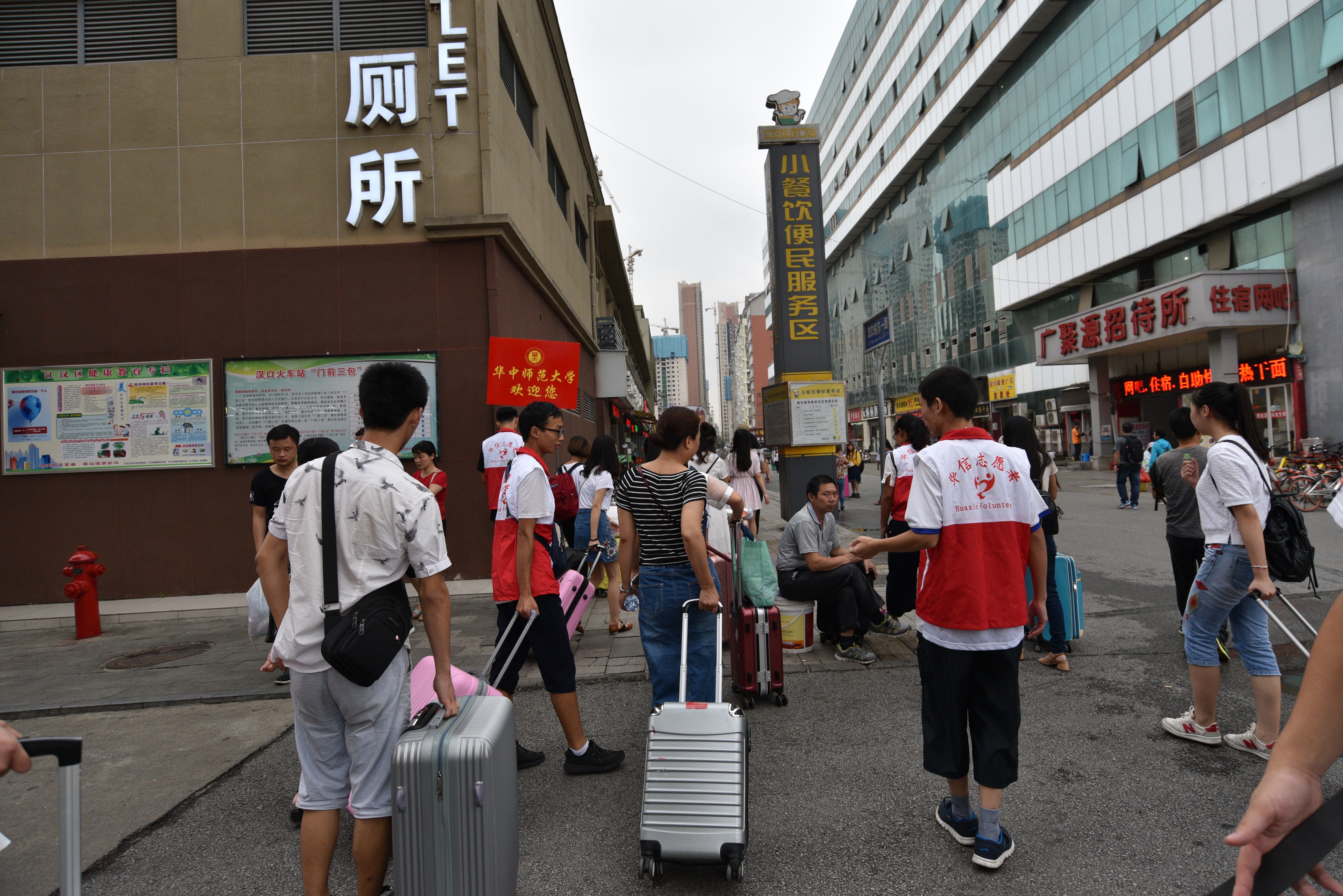 在汉口火车站,志愿者和工作人员早早的布置好休息区,设置好校旗和迎新牌子,一切井然有序等待新生到来。随着列车车次的不断驶入,一批又一批的人员流动加上火车站人员复杂,这些都给志愿者的工作带来了干扰。由里到外,近一百米一个牌位,新生走出车站全程有志愿者陪同。在出站口的几名志愿者举着牌子指引新生,确认身份后,在由志愿者带领下前往休息处。核对报备好身份信息后,志愿者便安排新生及其陪同家长就坐,随着来临人数的增多,志愿者也不断地添搬椅子,并倒送茶水以缓解新生和家长的旅途劳累。