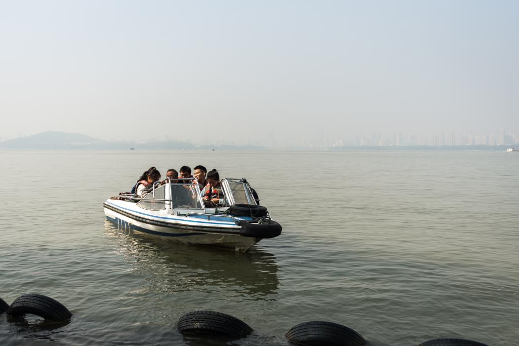 到了梅园码头,一部分同学坐快艇感受海浪般的刺激,呐喊欢呼不断,掌声惊喜连连,在陆地上的同学们分着零食,玩着游戏,每个人笑颜如花,纵情享乐!
