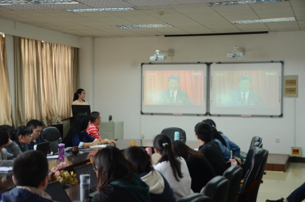 会议第一项是观看十九大视频,学习十九大精神。第一个视频是“十九届中共中央政治局常委同中外记者见面”的直播,第二个是十九大的回顾报告。