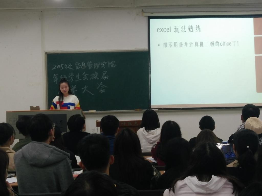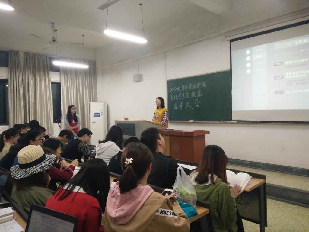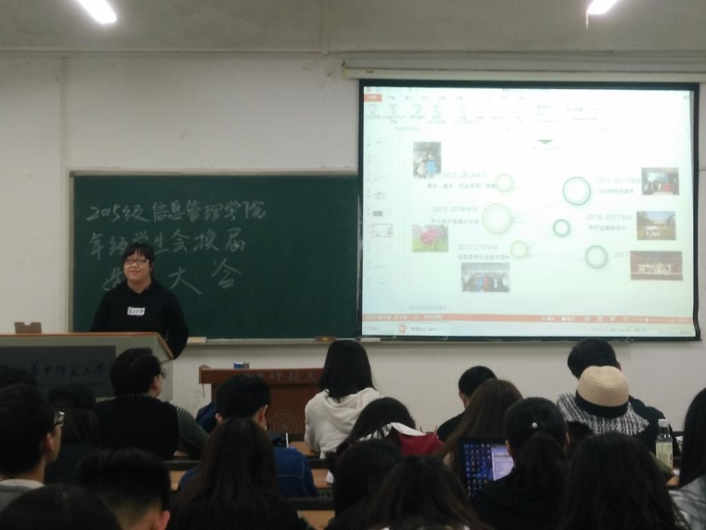 (通讯员 张紫西)2017年10月22号晚上7点,信息管理学院2015级在8303教室进行了晚点名暨15级年级学生会换届大会。大会由原年级团总支刘星月同学主持,15级辅导员蒋可鸣和2015级全体学生参与。