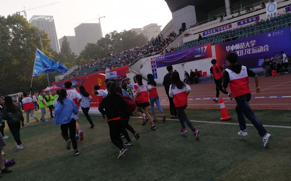 除了跑道上奔跑的运动员们,绿茵场上陪跑的同学也是一道亮丽的风景线。他们举着院旗,陪同运动员们,一起流汗、一起冲刺。我院男子5000米陪跑志愿者每个小组由八个同学组成,比赛过程中陪跑人员会在定点进行交接,确保同学们有足够的精力。“虽然自己无法做到坚持跑5000米,但跑个一两圈还是没问题的,希望我们的陪跑能鼓励运动员们坚持下去。”一位受访的陪跑同学这样说道。