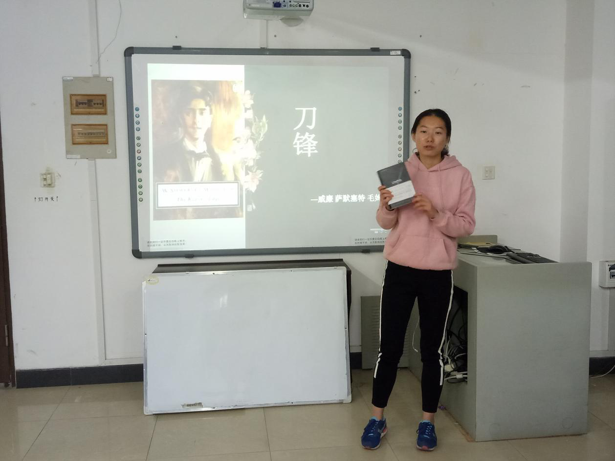 第一位分享人赵子安推荐了英国作家毛姆的《刀锋》。在介绍《刀锋》的主人公拉里的故事后,赵子安同学为大家提出了自己独到的见解。她认为,该作品在宣扬一种思想,追求人生的极致而不是在财富或者权利上的成功。她认为:“有人认为越过刀锋很艰辛,但我认为这里是指在刀锋刀刃上行走很艰辛。我在看完这本书之后并没有一种去追求人生真谛的冲动,而是在孤独探索。”最后,赵子安同学希望大家能够从这本书中得到一些人生启示,懂得刀锋即生活。