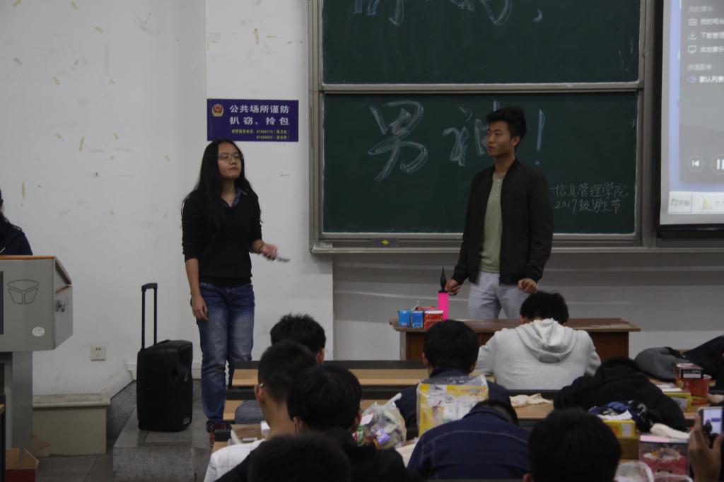 (通讯员 王慧莹 朱傅阳)2017年11月10号,信息管理学院2017级男生节晚会在九号楼9201教室如期举办,本次活动由院团委学生会文艺女生部主办,2017级赵弟发,曾睿主持,于晚六点三十分正式开始。