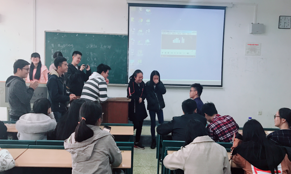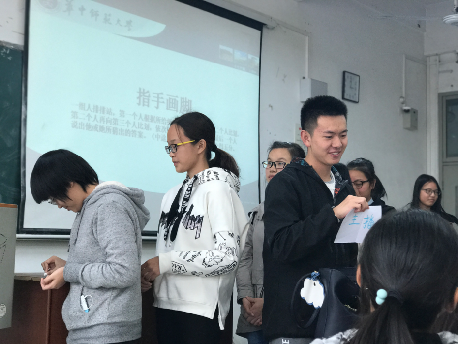 第二项是游戏环节。首先我们玩了“指手画脚”,类似“扎心了老铁”,“葛优躺”等网络热词的表演引得大家捧腹大笑。接下来的“击鼓传花”游戏,程秀峰老师也参与了进来,大家表演了节目、唱歌、跆拳道、讲笑话等节目,还有樊艳同学朗读了诗词鉴赏,朱傅阳同学背诵了《长恨歌》的第一大段,为活动增添了浓郁的文学气息,赢得了同学们的喝彩,现场气氛十分活泼。后面的“叫名字”、“猜歌名”等游戏环节也十分精彩,每个同学都积极参与了进来。在活动的最后,班委们为游戏积分最高组发放了小奖品。