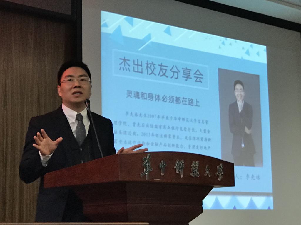 (通讯员 韩恬 黄赖华 陈心雨 蒋可鸣)11月25日上午10:00由华中师范大学信息管理学院杰出校友、2007届毕业生李先林先生主讲的 “灵魂和身体都必须在路上”分享会在逸夫国际会议中心一楼报告厅举办。校长助理、人事处处长任友洲,信息管理学院分党委书记刘宝卿、分党委副书记杨青松,深圳前海新富资本管理集团有限公司部分高管和各级博士生、研究生、本科生共同出席了本次分享会。分享会由信息管理学院副院长卢新元主持。