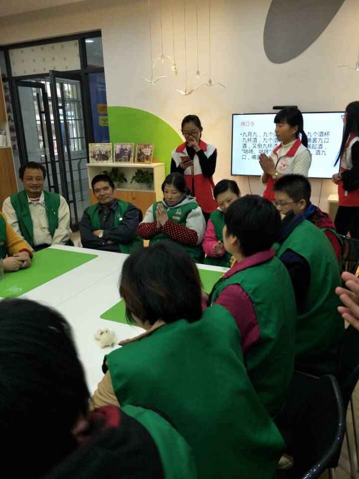 接着进入游戏《击鼓传花》环节。此次游戏,由志愿者宋非非播放选好的背景音乐,志愿者王海燕讲解游戏规则以及调动现场气氛。被选中的残疾人朋友可表演才艺,亦可说一段志愿者事先准备好的绕口令,残疾人朋友们有的唱歌,有的跳舞,有的吟诗,场景十分热闹。志愿者周慧表示:“这样的游戏,不仅锻炼了残疾人朋友们大胆表现的能力,同时也增进了志愿者同他们之间的友情。”