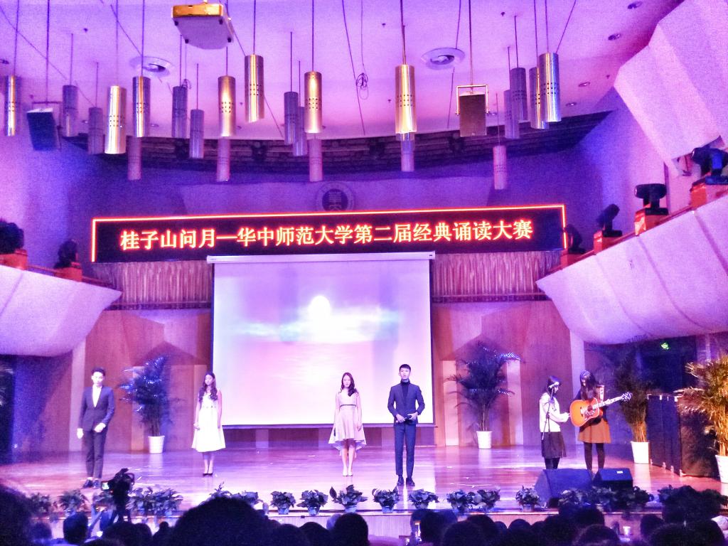 晚上六点二十,1702班全体同学在东区篮球场集合完毕。在班长周梦蝶,团支书张学偲的带领下全体同学分组前往音乐厅,有序的排队进入比赛场地,按照组织方的安排入座。接下来,桂子山问月--华中师范大学第二届经典诵读大赛正式开始。