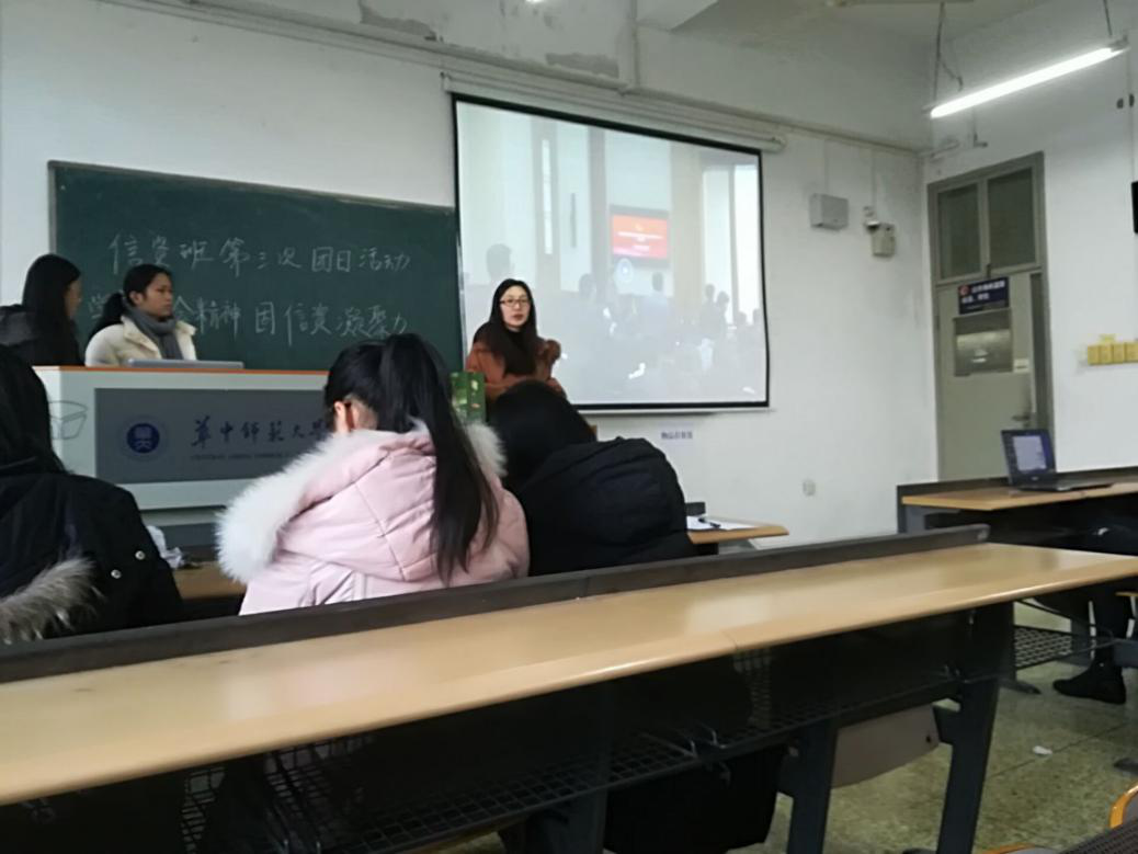 活动即将开始,信资1701班团支书张佩玲上台发言,介绍团代会背景,解说团代会精神,并宣布第三次团日活动的召开,拉开了团日活动的序幕。