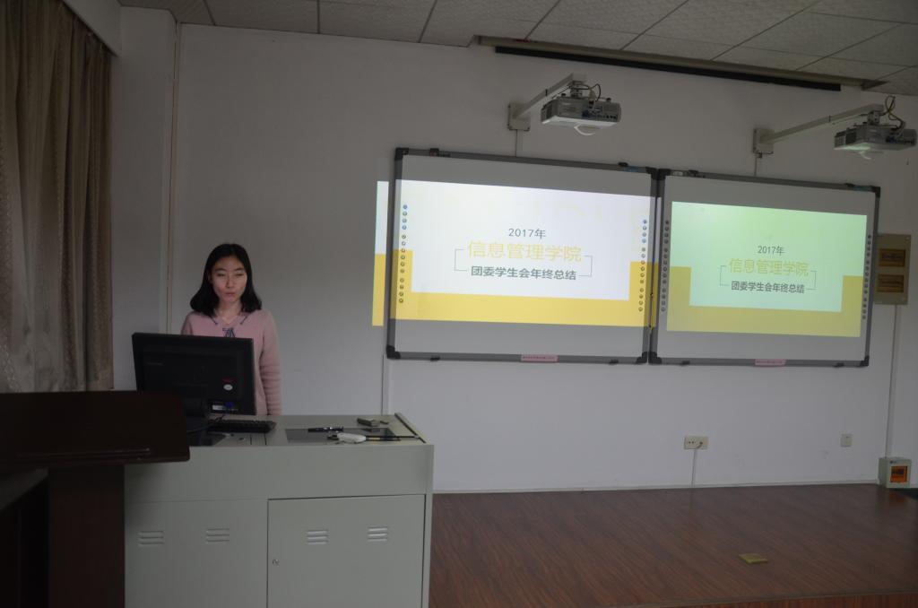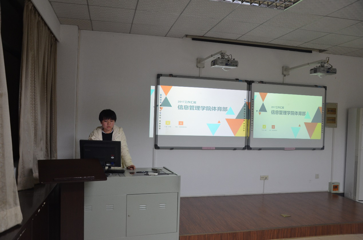 以ppt作为展示工具,展示从权益调研部开始。权益调研部部长胡婧岚从部门建设,工作成果、年终总结、工作展望四个层面向大家介绍权益调研部的工作职能和日常工作。秘书长米慧馨详细介绍了一下日常工作情况,也多角度的展现秘书处的工作职能。体育部长李娟结合一个学期多场次的篮球、足球比赛情况,整理了体育部门运作的长处和不足。青协负责人刘思岩以青协的精神作为切入点,详细介绍了一个学期以来青协在日常志愿活动的工作情况和公益项目的进展情况。创新创业中心部长陈欢以e-stage的总结开头利用SWOT分析法多方面的介绍了学院在双创方面的情况。宣传中心部长韦岳良就工作总结、成果展示、工作展望三个方面展示宣传中心的部门工作。