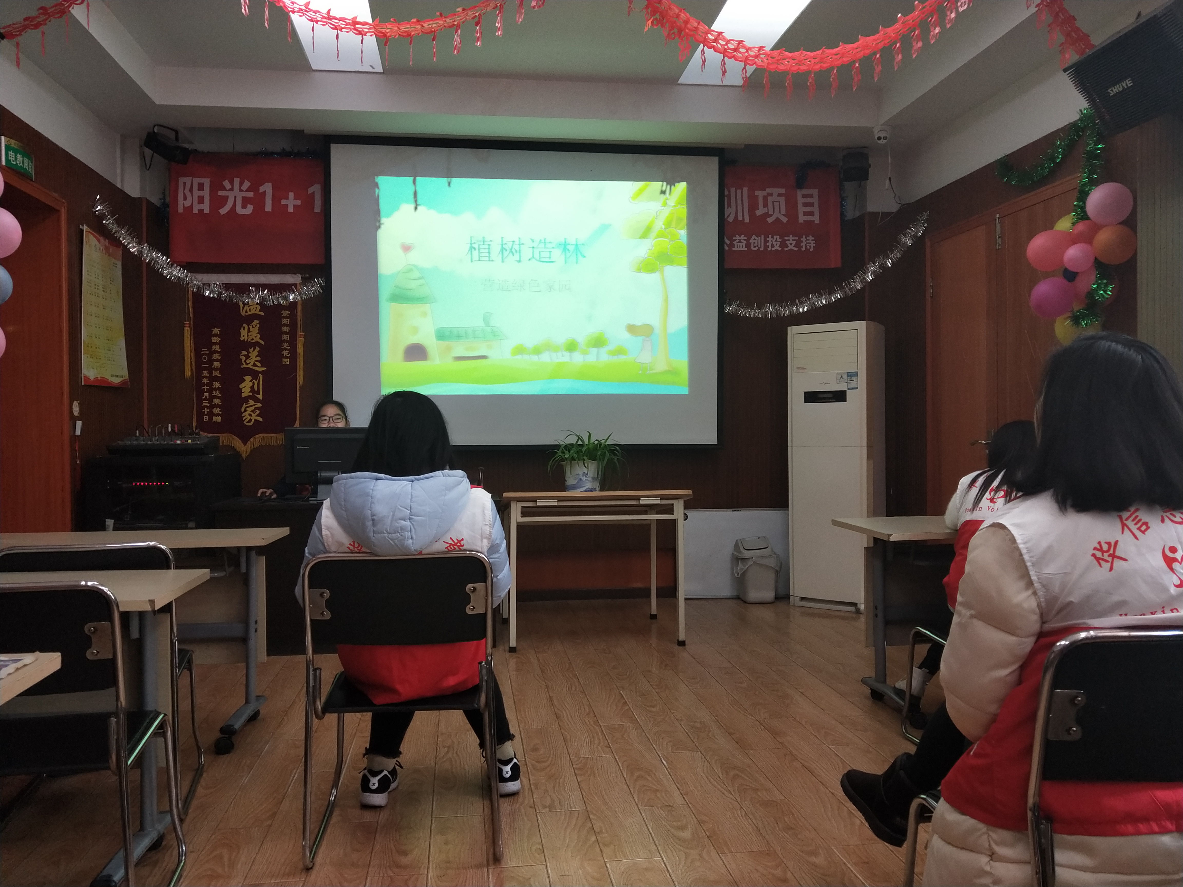 到9:40,大家来到教室,本次教学正式开始。志愿者黄欣英播放着关于植树节的PPT,带领大家了解一些关于植树节的基本知识和森林对人类的益处,从而激发大家爱林、造林的热情,增强大家保护树木、保护森林的意识。还给大家播放了《好大一棵树》、《植树歌》等歌曲。